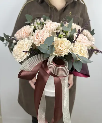 Букет составляется непосредственно в день доставки из свежих цветов, а затем с приятной улыбкой вручается адресату.