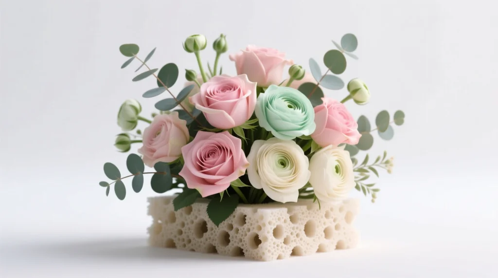 Флористическая пена (оазис) — это синтетический пористый материал, способный впитывать и удерживать большое количество воды.
