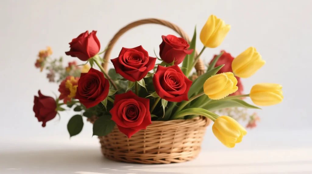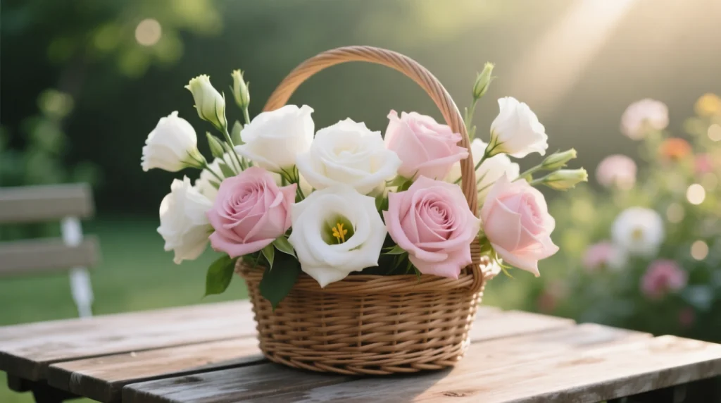 Пропорции: Корзина не должна выглядеть «лыбой» (мало цветов) или «заваленной» (цветы вываливаются). Цветы должны гармонично заполнять объем, может быть, немного «вытекать» за края изящным каскадом.