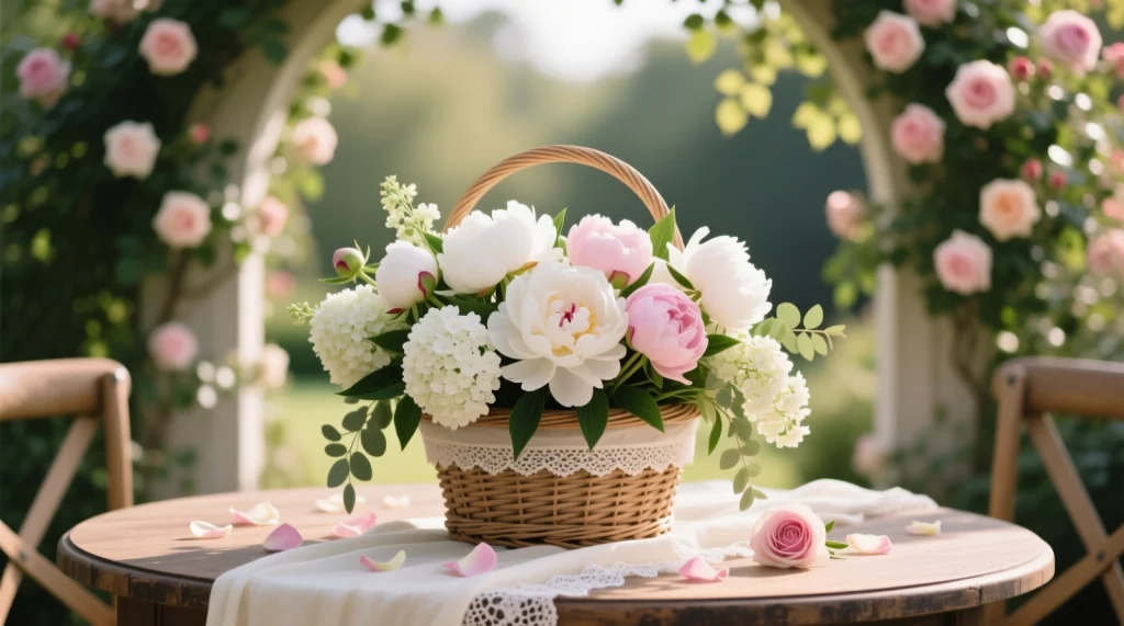Форма корзины: Классическая овальная или круглая. Можно рассмотреть изящные корзины-сердца или с ажурным плетением.