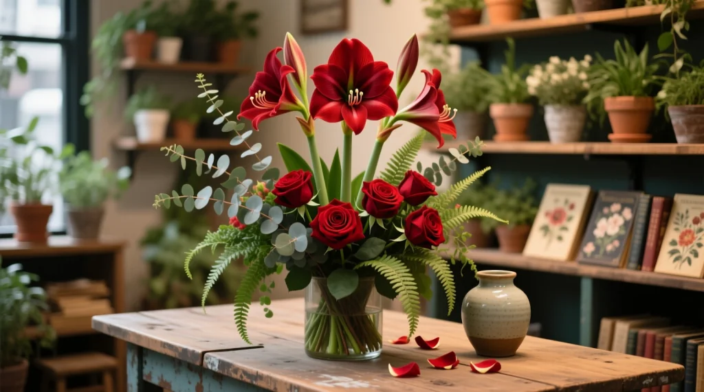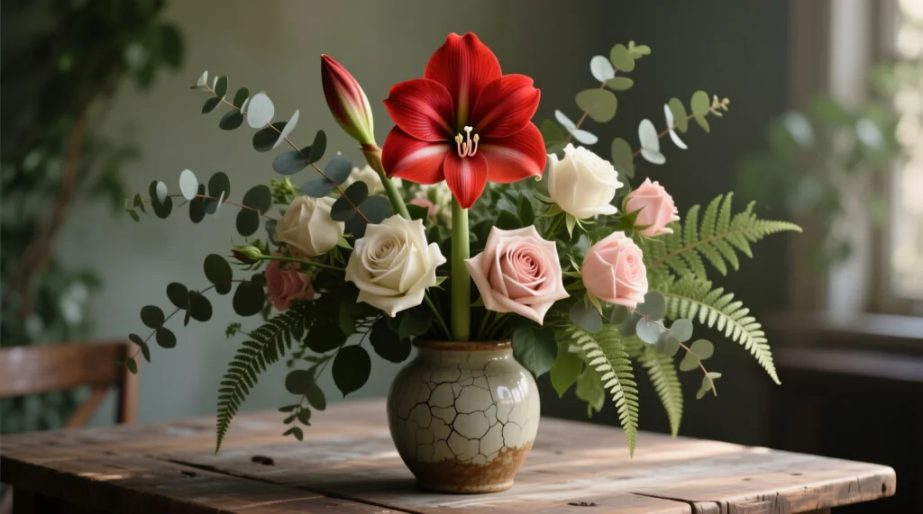 Суть: Длинные стебли амариллиса задают высоту, кустовые розы (сливочные, бордовые) заполняют средний ярус, аспидистра или рускус добавляют графичности.