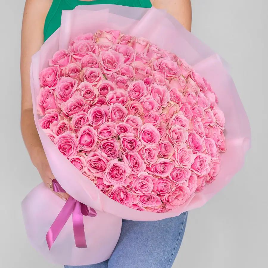 На фото - Букет из 101 розовой розы. В составе данной композиции: Розы нежный оттенок 40 см - 101 шт,
