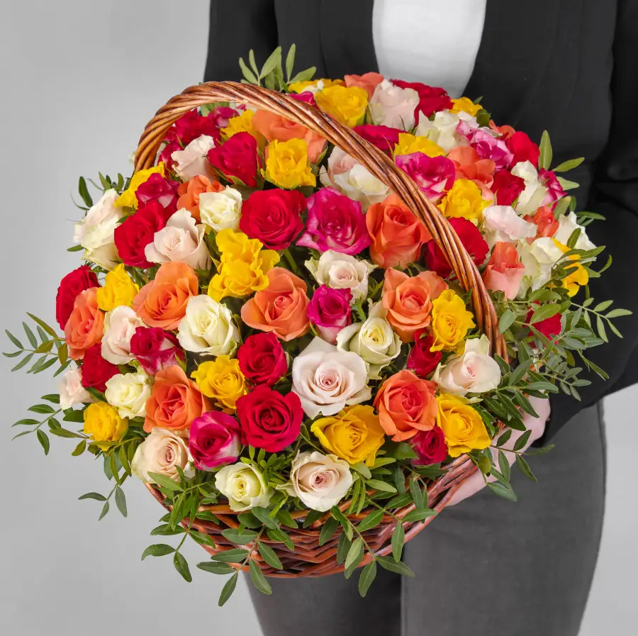На фото - 101 Роза Микс в корзине. В составе данной композиции: Роза Кенийская - 101 шт,