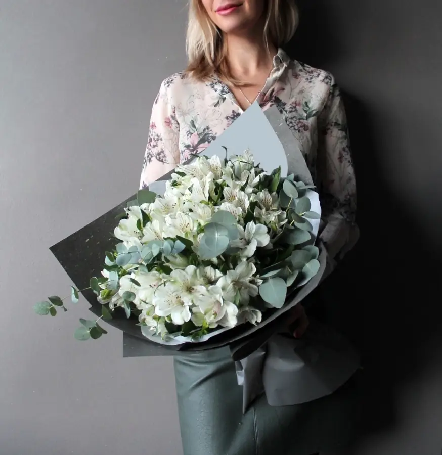 У нас можно заказать 25 Белых Альстромерий с эвкалиптом в упаковке за 6370 руб.