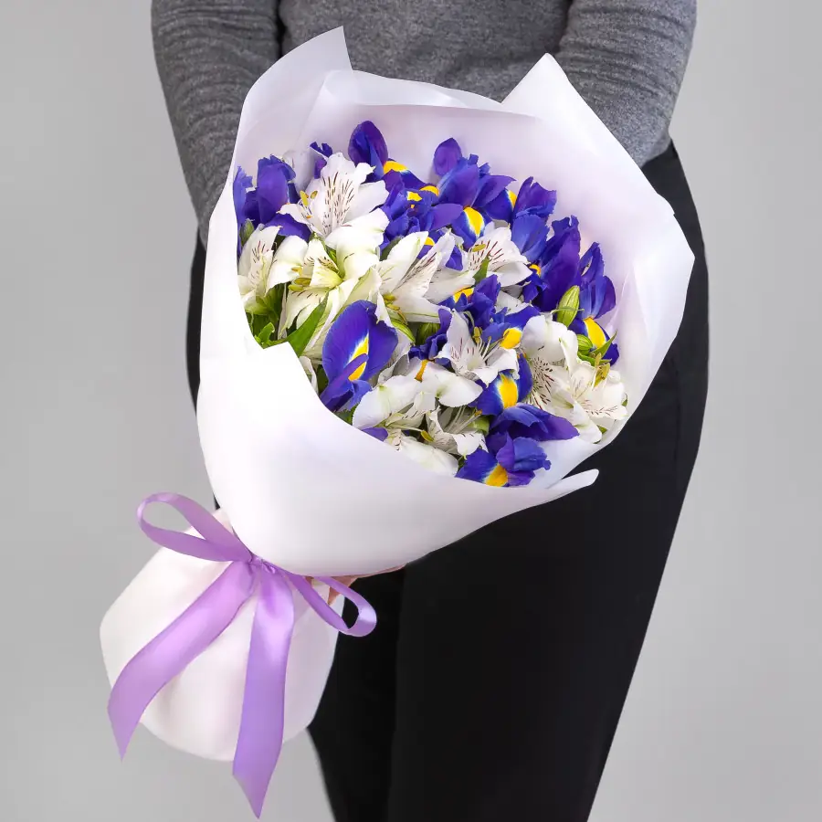 На фото - Букет из ирисов и белой альстромерии . В составе данной композиции: Альстромерия - 5 шт,