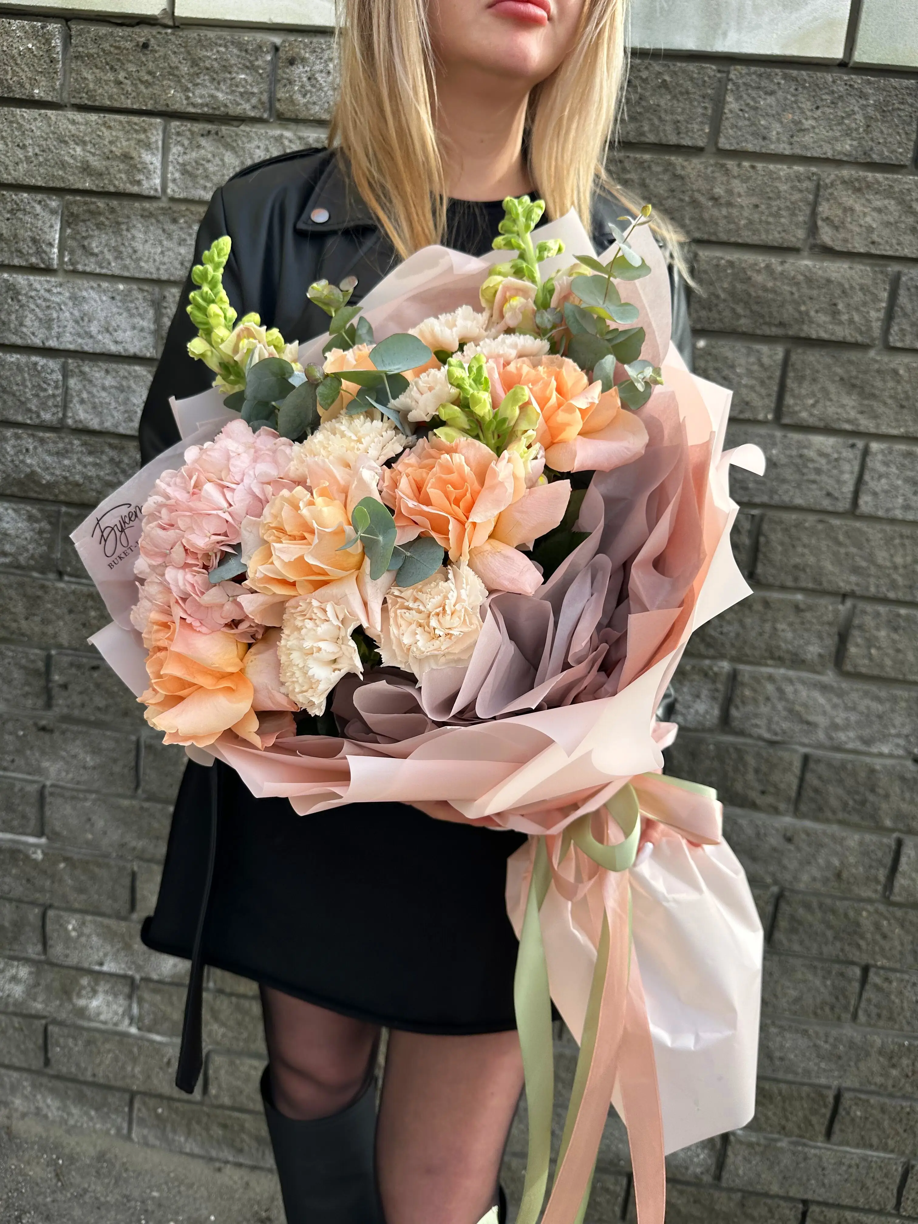 Букет составляется непосредственно в день доставки из свежих цветов, а затем с приятной улыбкой вручается адресату.