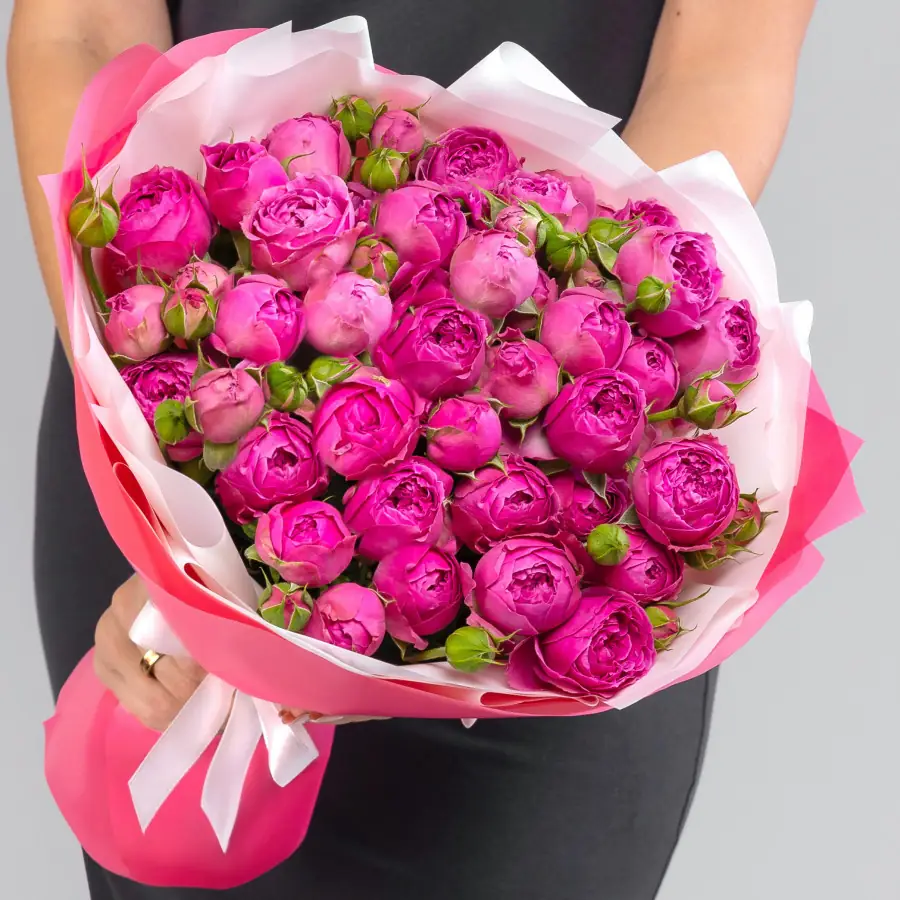 Кустовая Пионовидная Розовая Роза 11 шт - пример оформления на фото. Состоит из: Розовая роза кустовая пионовидная - 11 шт,