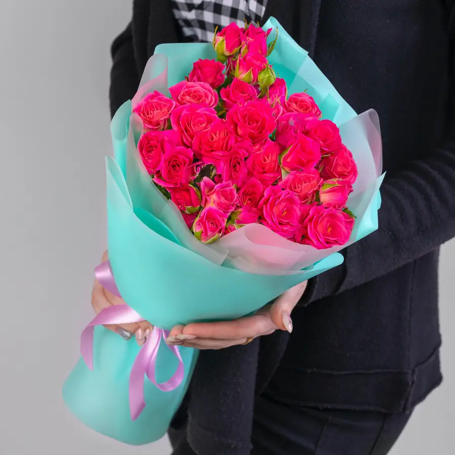 11 Ярко-Розовых в упаковке - пример оформления на фото. Состоит из: Роза Кустовая - 11 шт,