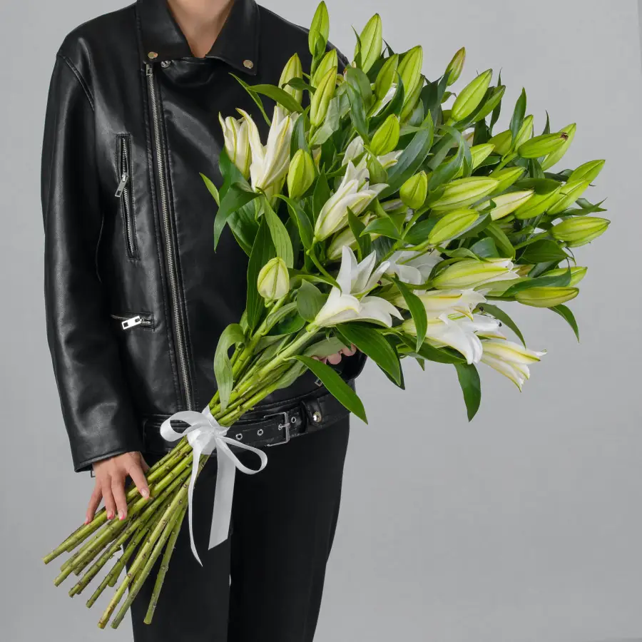 15 Снежных Лилий - пример оформления на фото. Состоит из: Лилия - 15 шт,