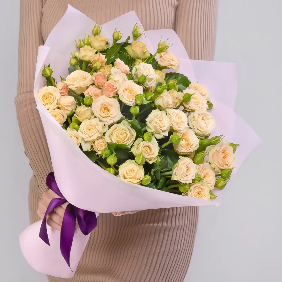 17 Кремовых Роз в упаковке - пример оформления на фото. Состоит из: Роза Кустовая - 17 шт,