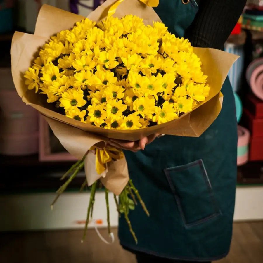 17 Желтых Хризантем в упаковке - пример оформления на фото. Состоит из: Хризантема кустовая - 17 шт,
