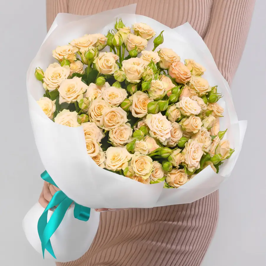 Нежная композиция из Бежевых роз - пример оформления на фото. Состоит из: Роза Кустовая - 19 шт,