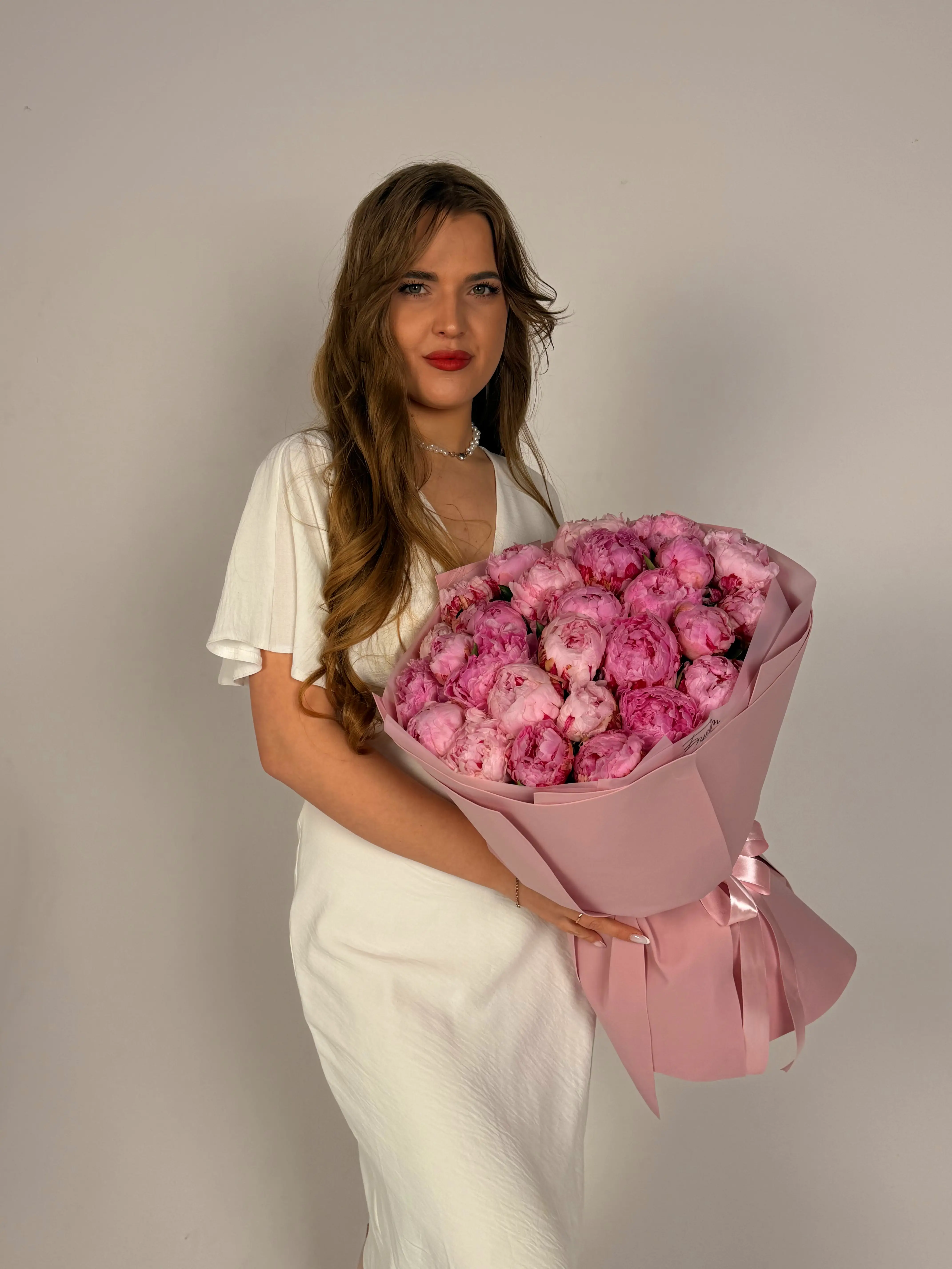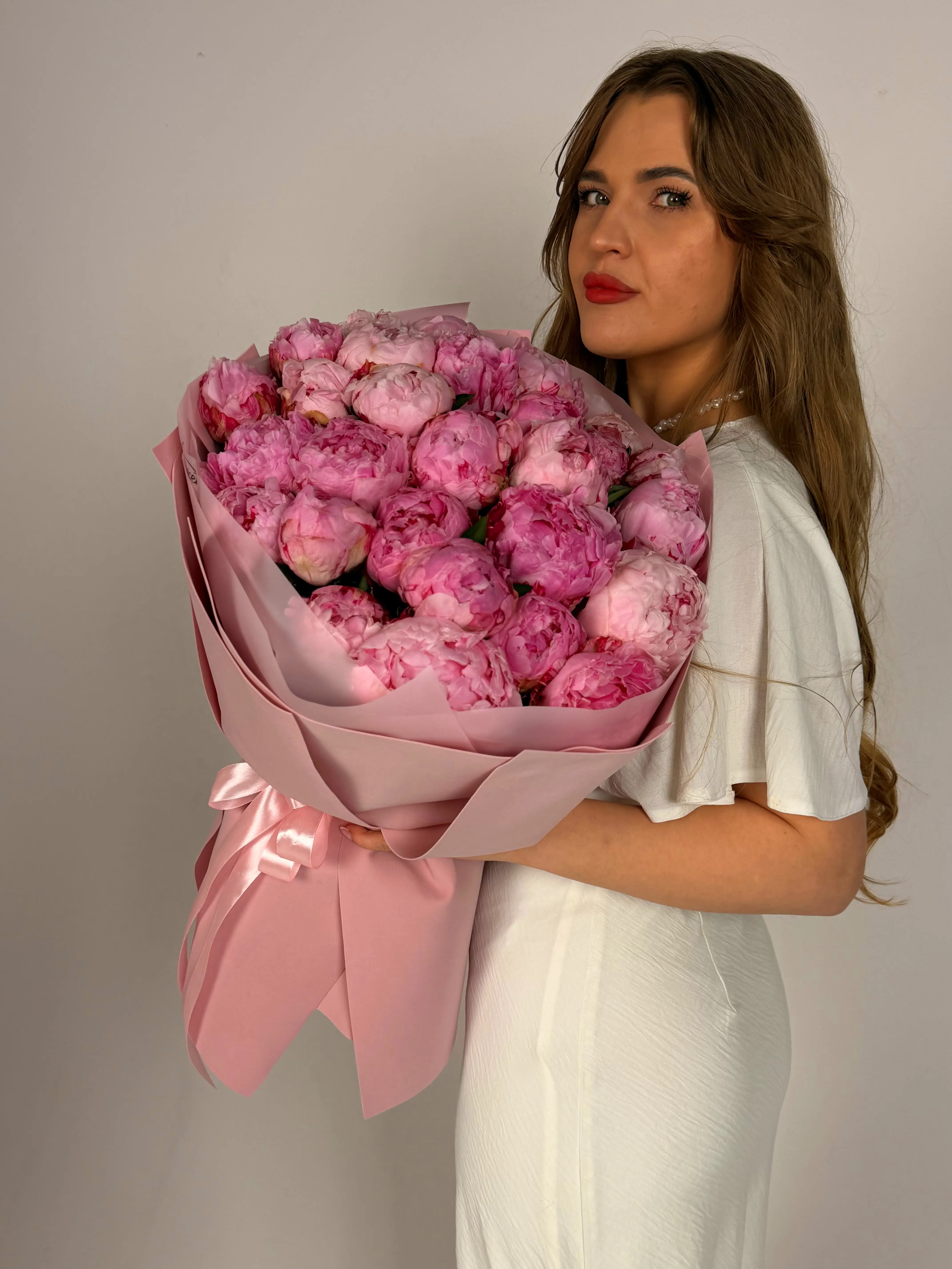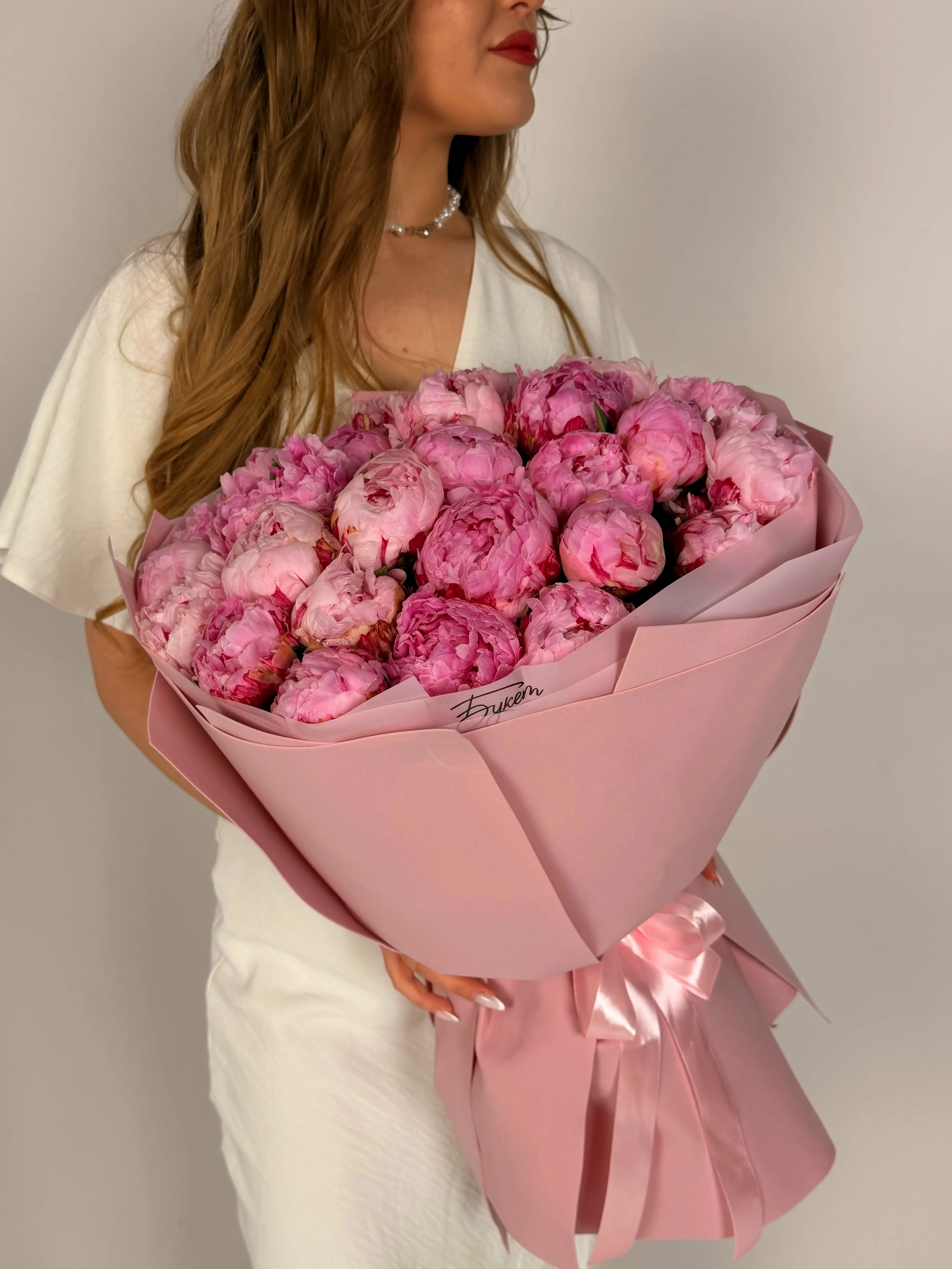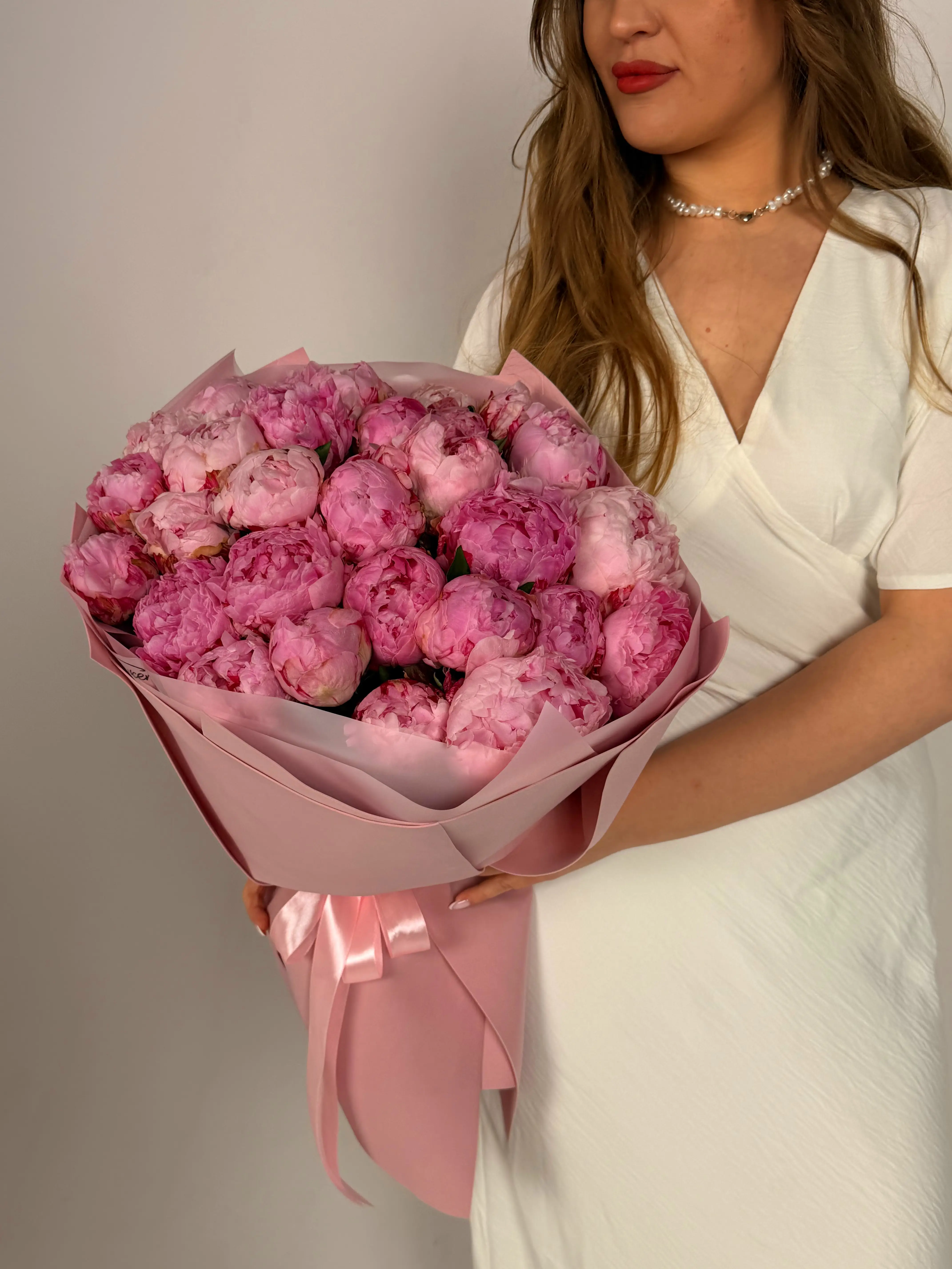25 Пионов в розовой упаковке — купить по цене от 17400 руб. с доставкой в Дзержинске