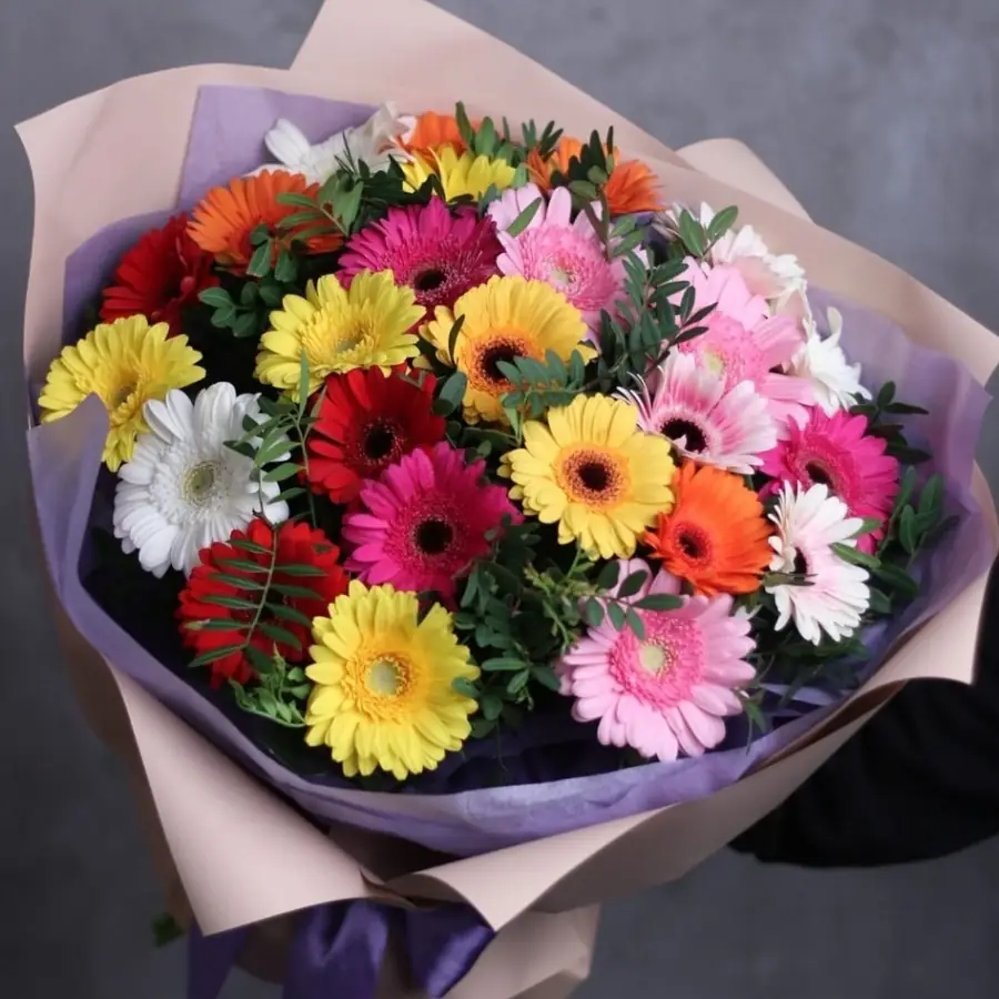 25 Разноцветных Гербер - пример оформления на фото. Состоит из: Гербера - 25 шт.,