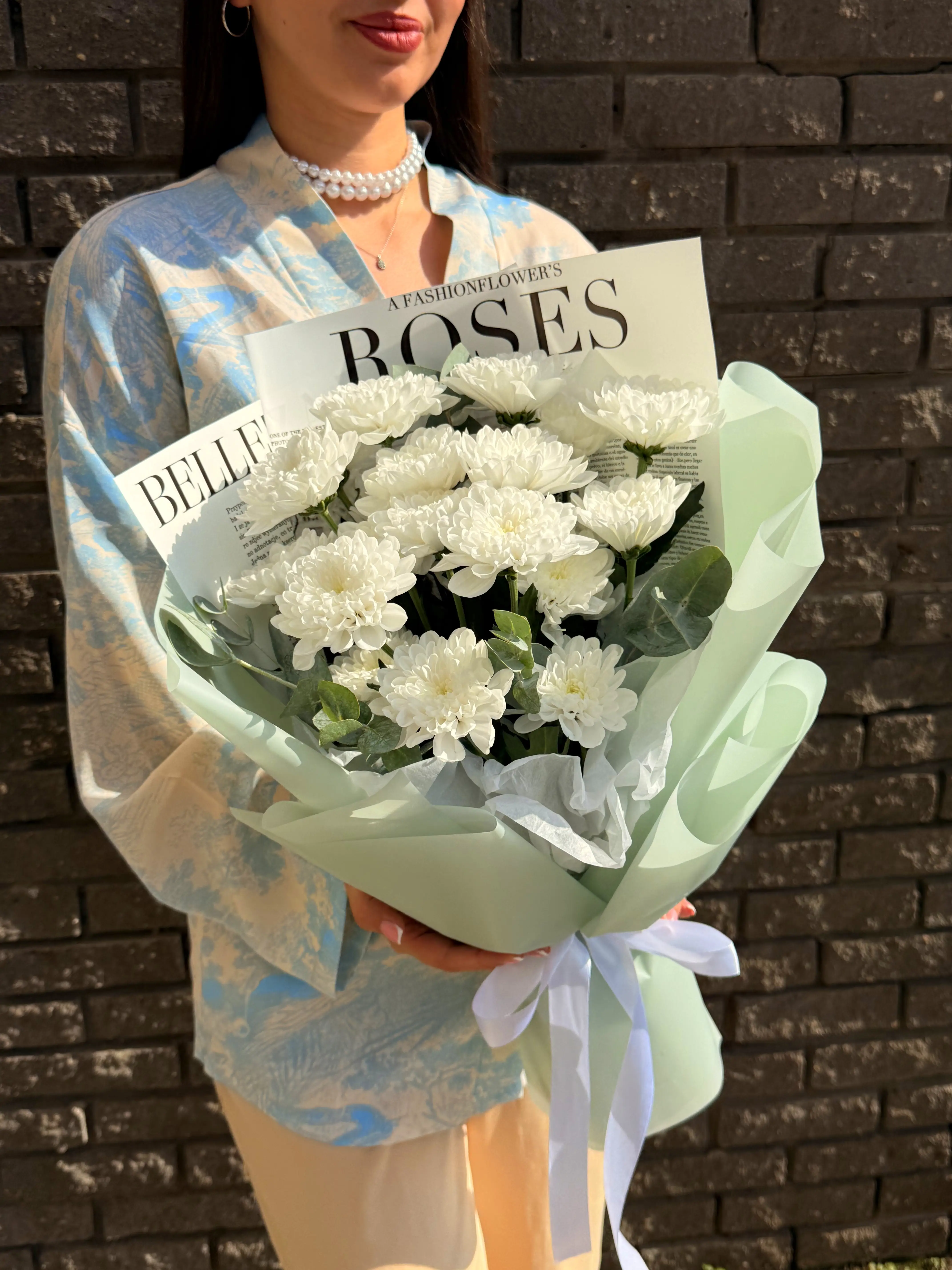 3 Кустовые хризантемы в упаковке - пример оформления на фото. Состоит из: Хризантема кустовая - 3 шт,