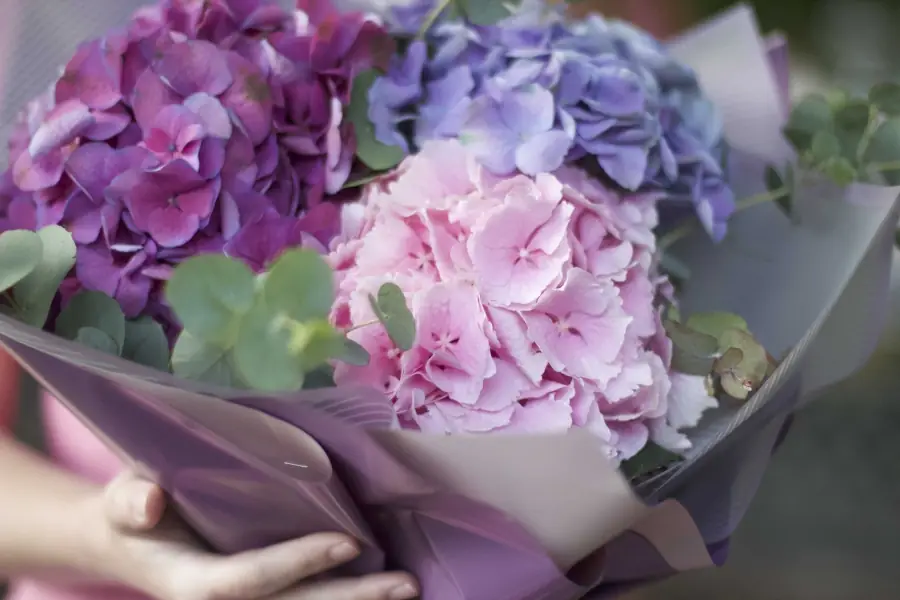 3 Разноцветные Гортензии в дизайнерской упаковке - пример оформления на фото. Состоит из: Гортензия Фиолетовая - 1 шт.,