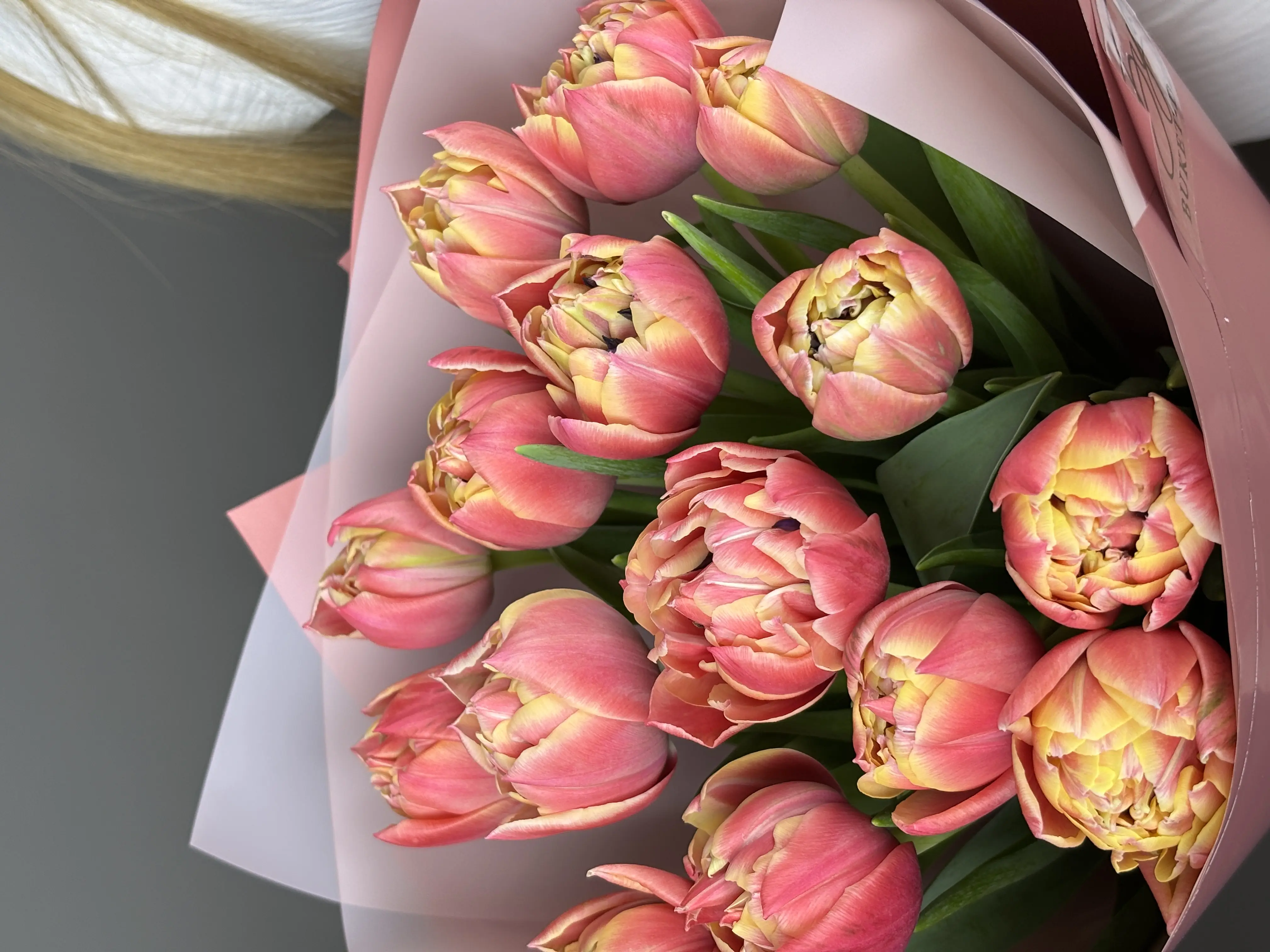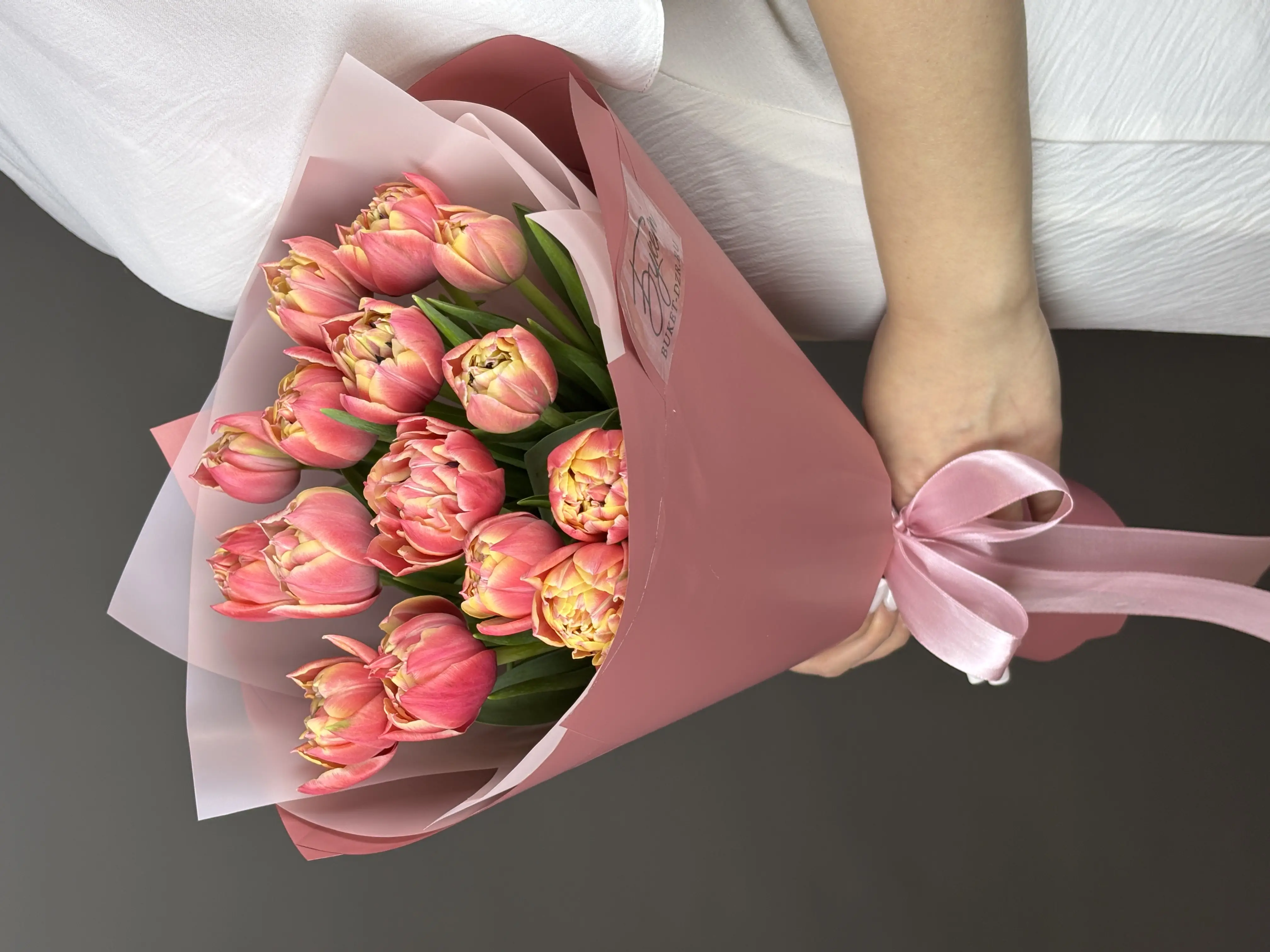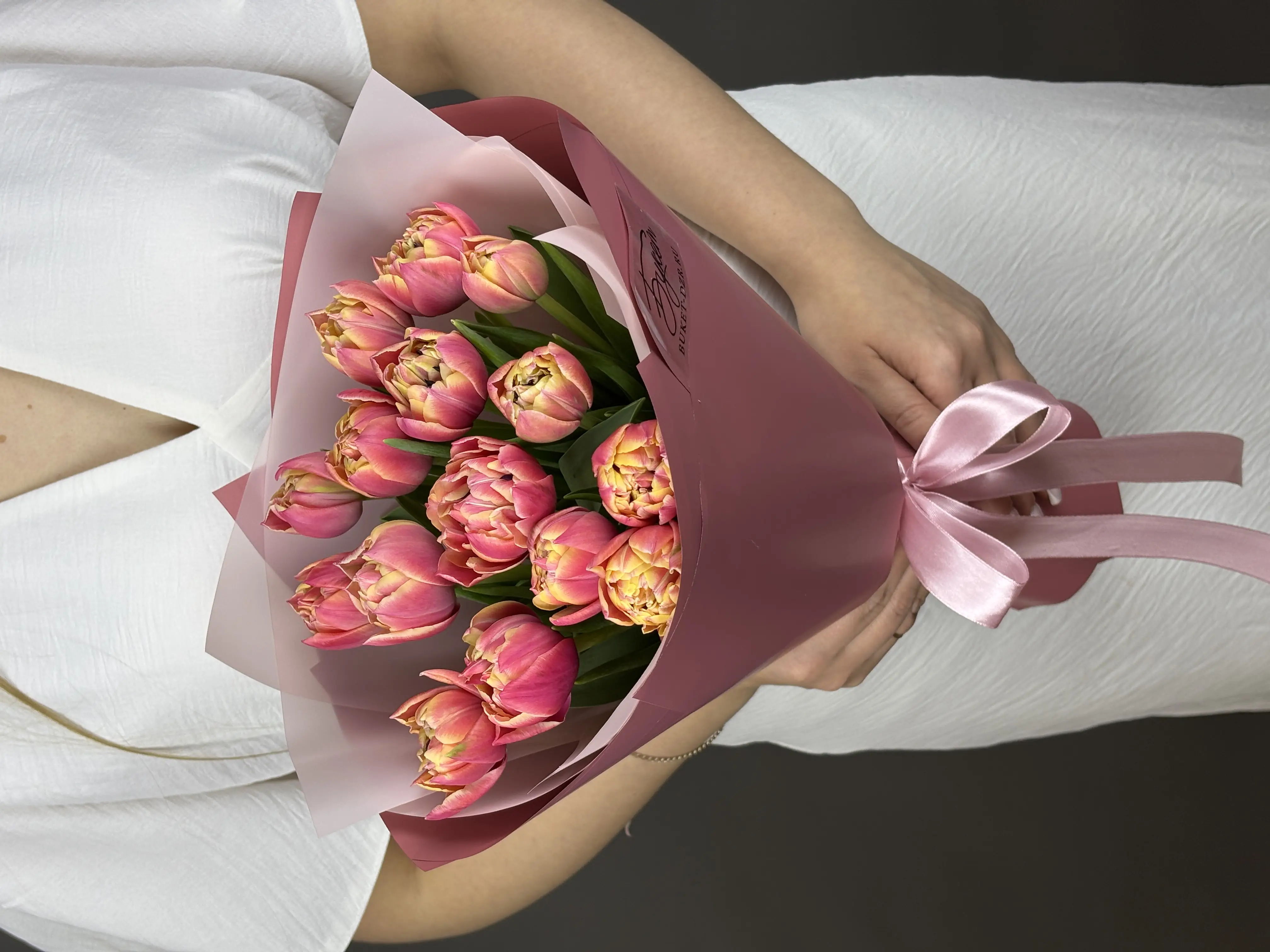 15 Пионовидных Тюльпанов Колумбус - пример оформления на фото. Состоит из: Тюльпан - 15 шт., Дизайнерская упаковка, Лента атласная . Собираем только из свежих цветов, после сборки пришлем Вам фото. Доставим по г. Дзержинску и Нижегородской области, стоимость - 3800 руб..