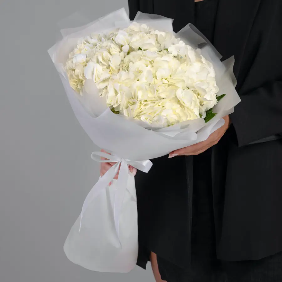 5 Белых Гортензий - пример оформления на фото. Состоит из: Гортензия - 5 шт,