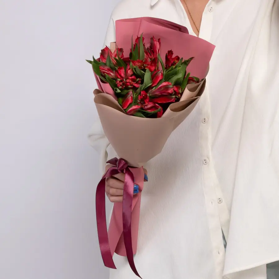5 Красных Альстромерий - пример оформления на фото. Состоит из: Альстромерия Красная - 5 шт.,