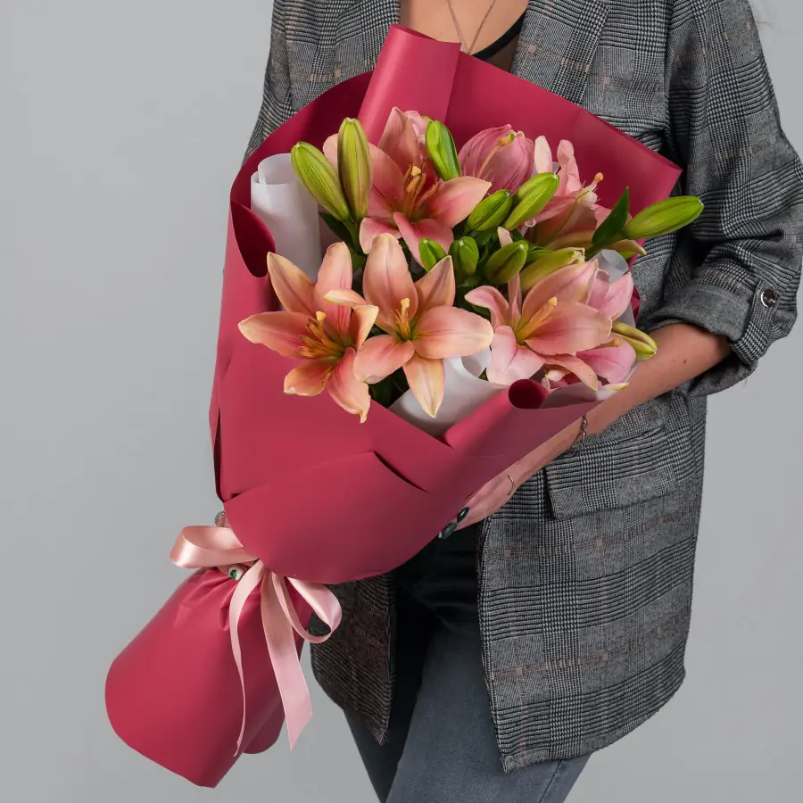 5 Розовых Лилий - пример оформления на фото. Состоит из: Лилия - 5 шт,
