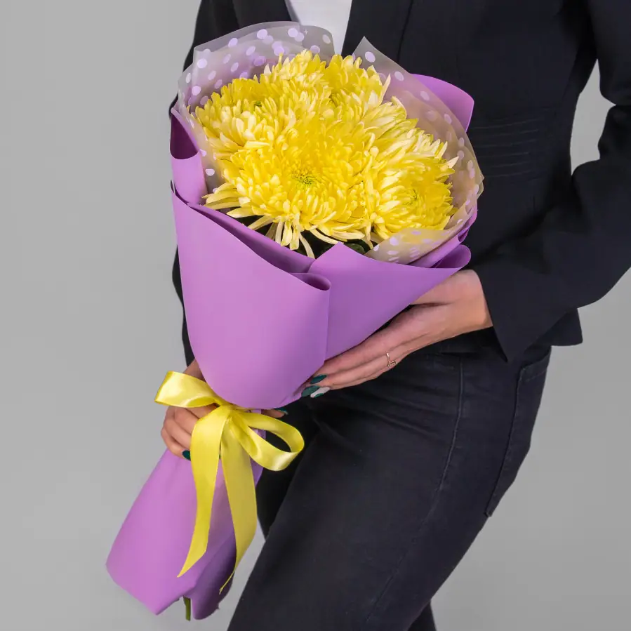 5 Желтых Игольчатых Хризантем - пример оформления на фото. Состоит из: Хризантема одноголовая - 5 шт,