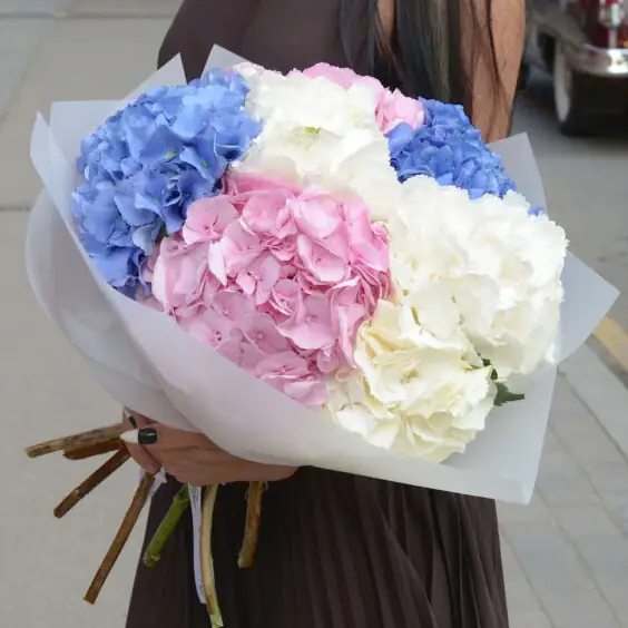 7 Разноцветных Гортензий - пример оформления на фото. Состоит из: Гортензия Голубая - 2 шт.,