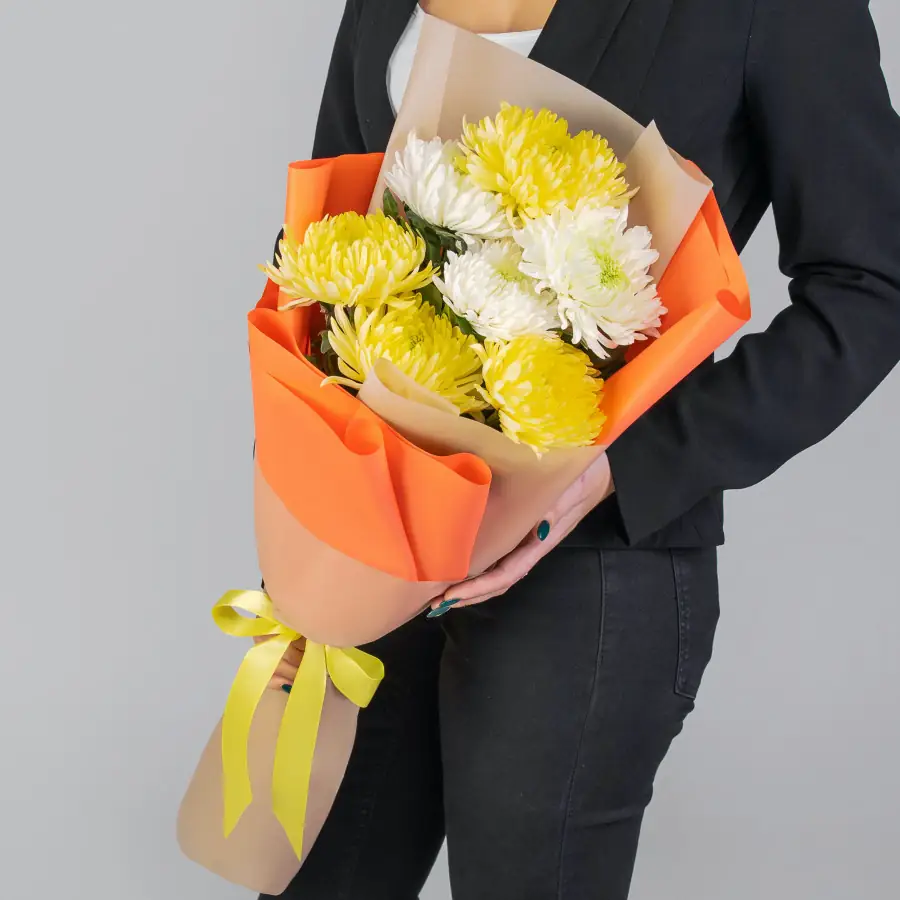 Букет из желтых и белых хризантем - пример оформления на фото. Состоит из: Хризантема одноголовая - 7 шт,