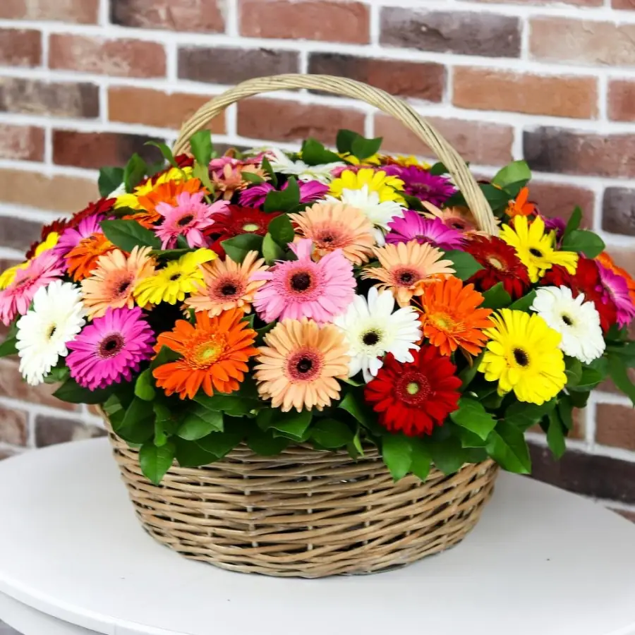 75 Разноцветных Гербер в корзине - пример оформления на фото. Состоит из: Гербера разных цветов - 75 шт.,