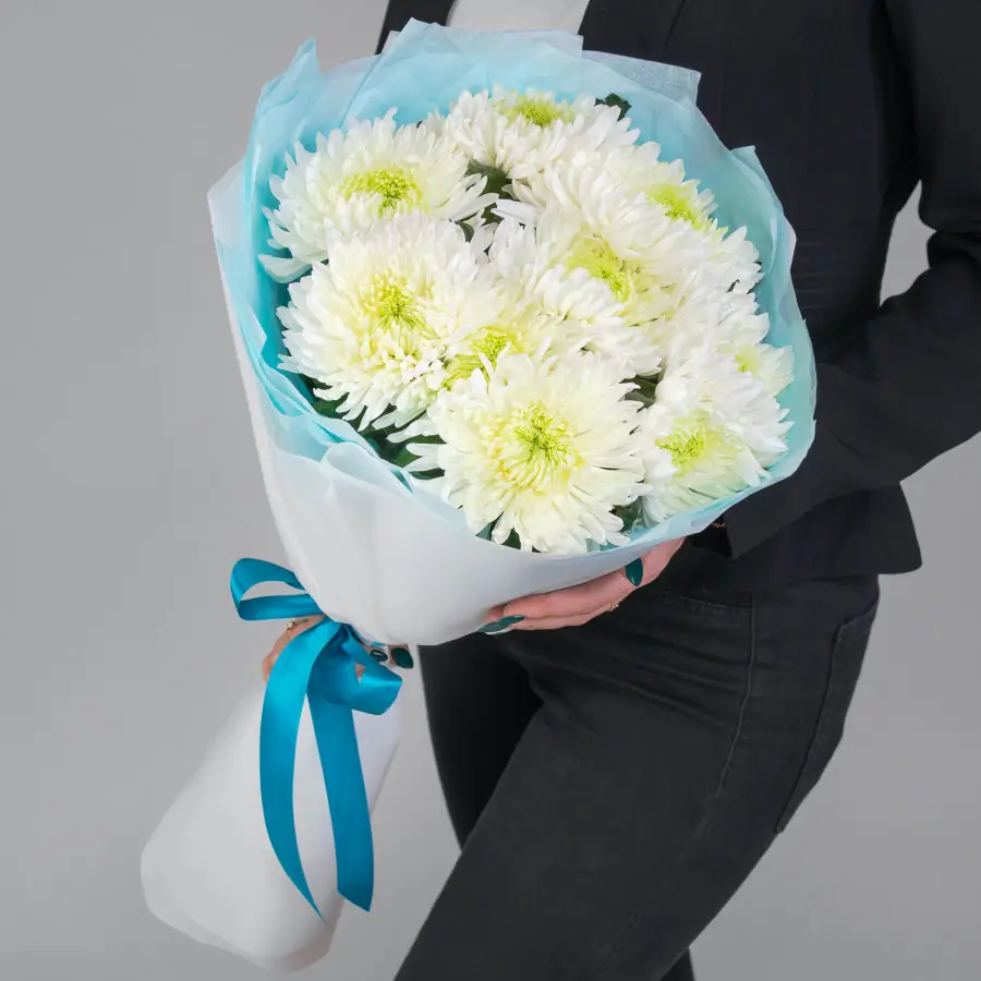 9 Игольчатых Хризантем - пример оформления на фото. Состоит из: Хризантема одноголовая - 9 шт,