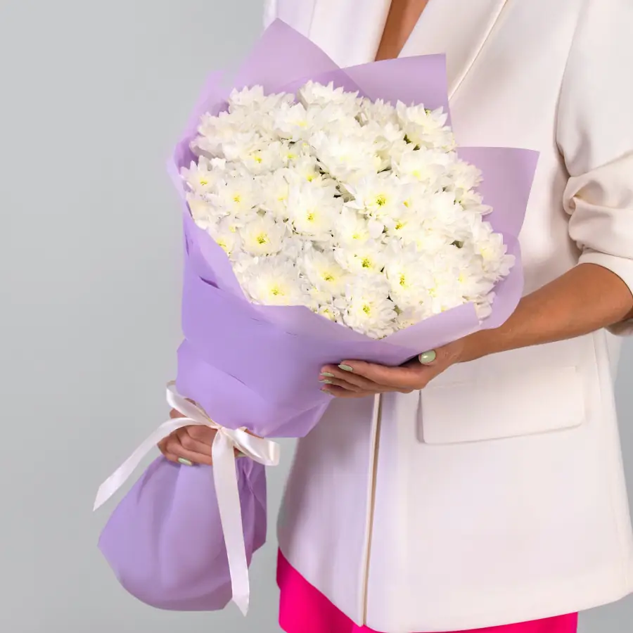 9 Кустовых Хризантем в упаковке - пример оформления на фото. Состоит из: Хризантема кустовая - 9 шт,