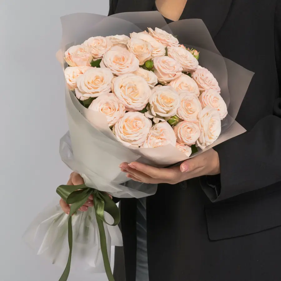 9 Кустовых Пионовидных Кремовых Роз - пример оформления на фото. Состоит из: Роза кустовая пионовидная - 9 шт,
