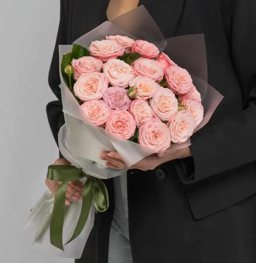 9 Кустовых Пионовидных Персиковых Роз - пример оформления на фото. Состоит из: Роза кустовая пионовидная - 9 шт,