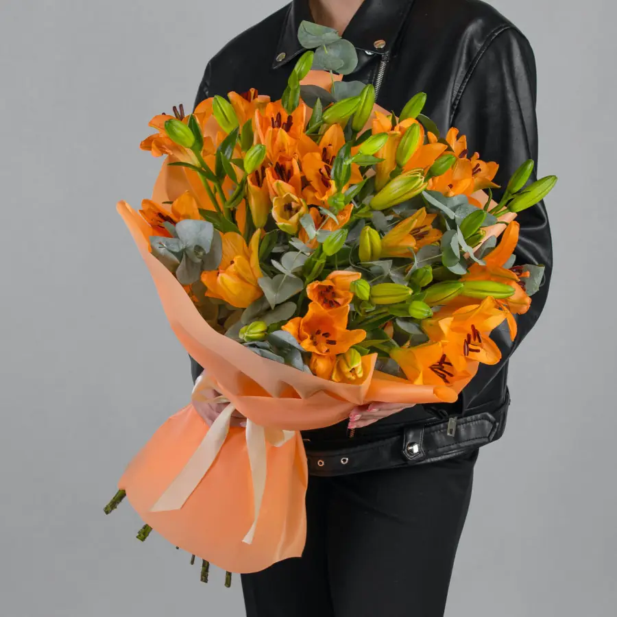 9 Лилий с эвкалиптом - пример оформления на фото. Состоит из: Лилия - 9 шт,
