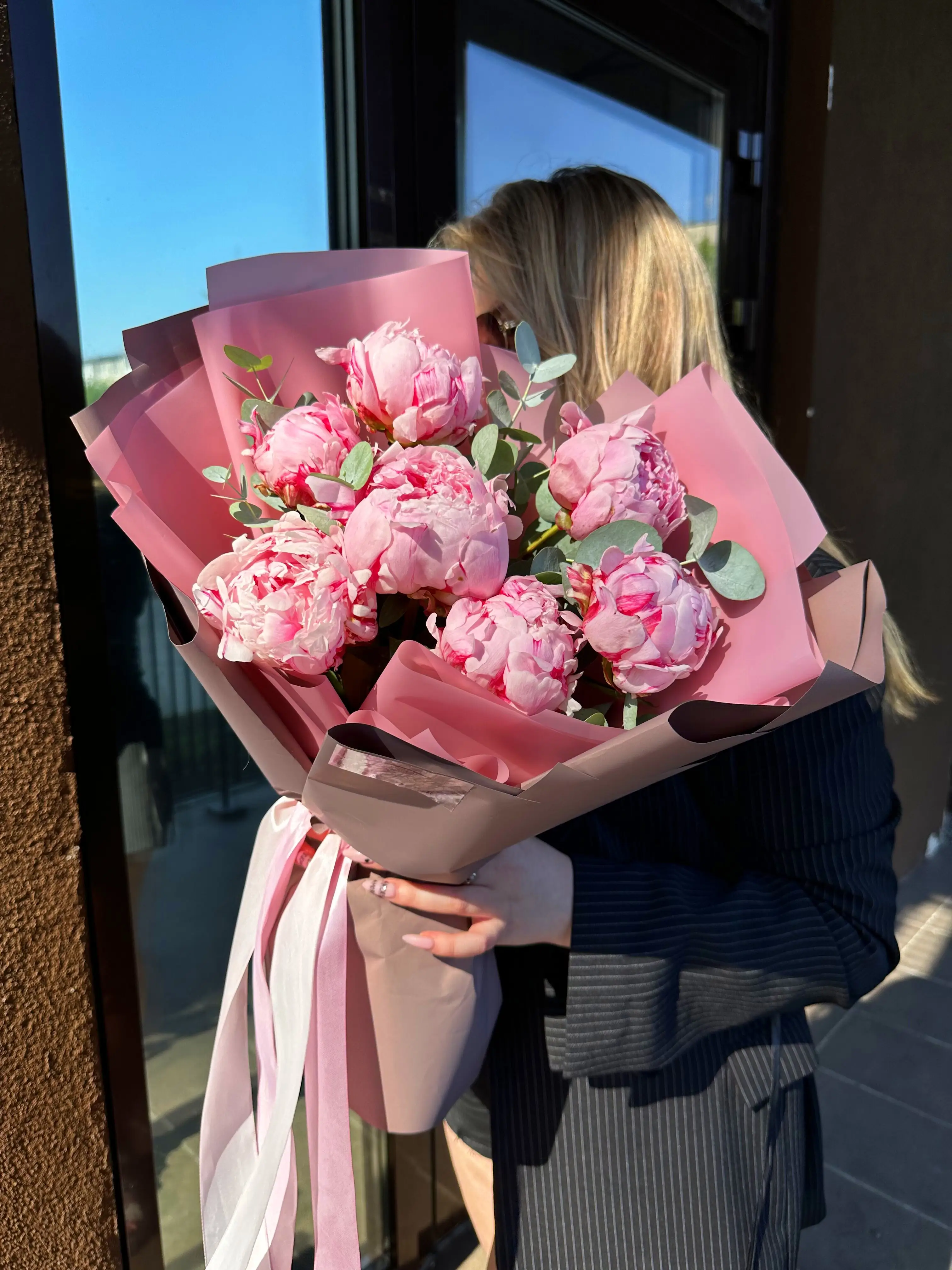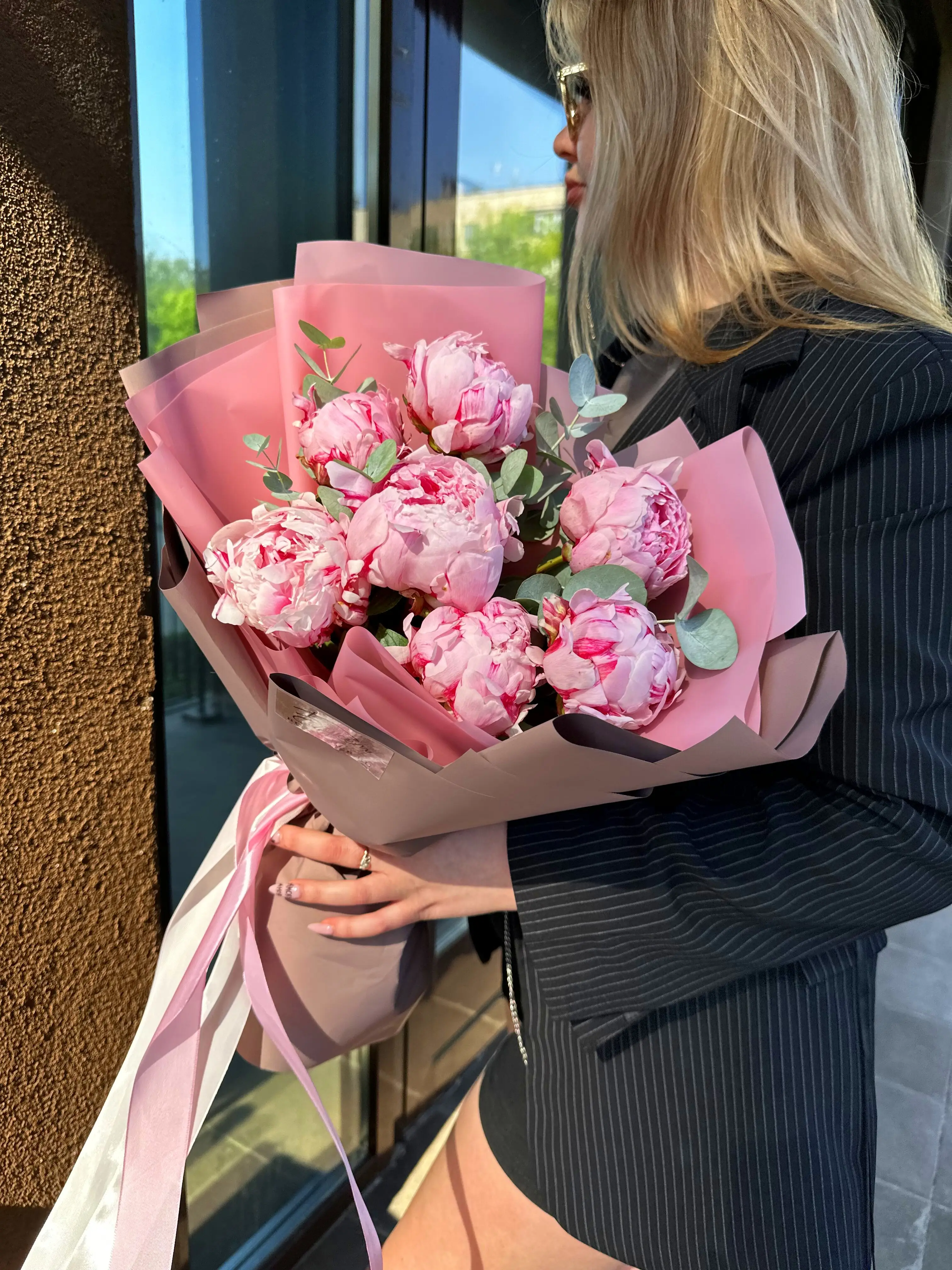 Букет из 7 пионов с эвкалиптом - пример оформления на фото. Состоит из: Пион - 7 шт,
