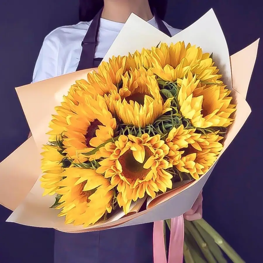 Букет "13 Подсолнухов" - пример оформления на фото. Состоит из: Подсолнух Желтый - 13 шт.,