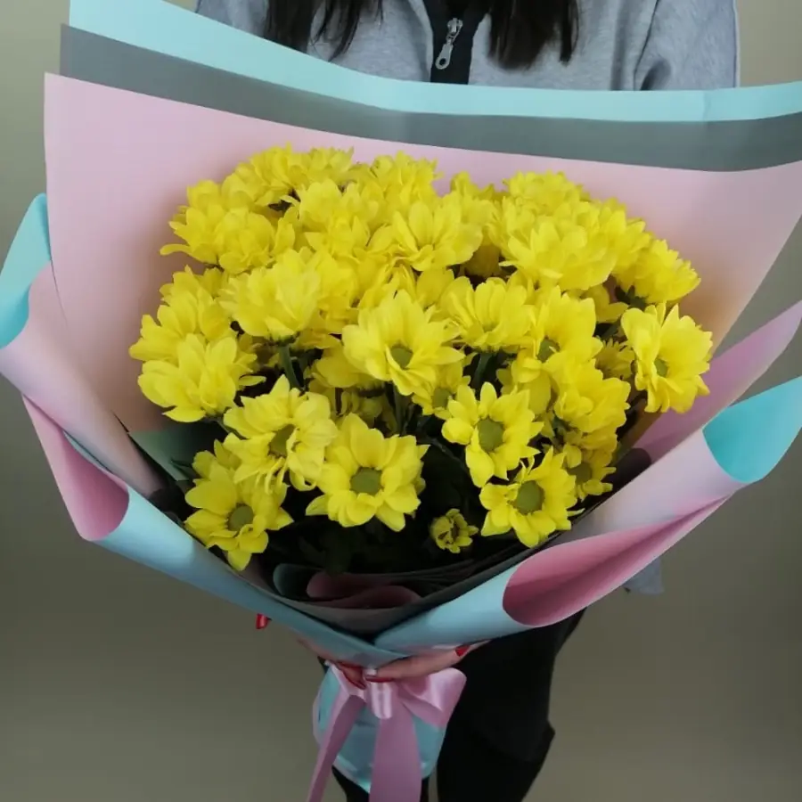 Букет "9 Жёлтых Кустовых Хризантем" - пример оформления на фото. Состоит из: Хризантема Кустовая Ромашка Желтая - 9 шт.,