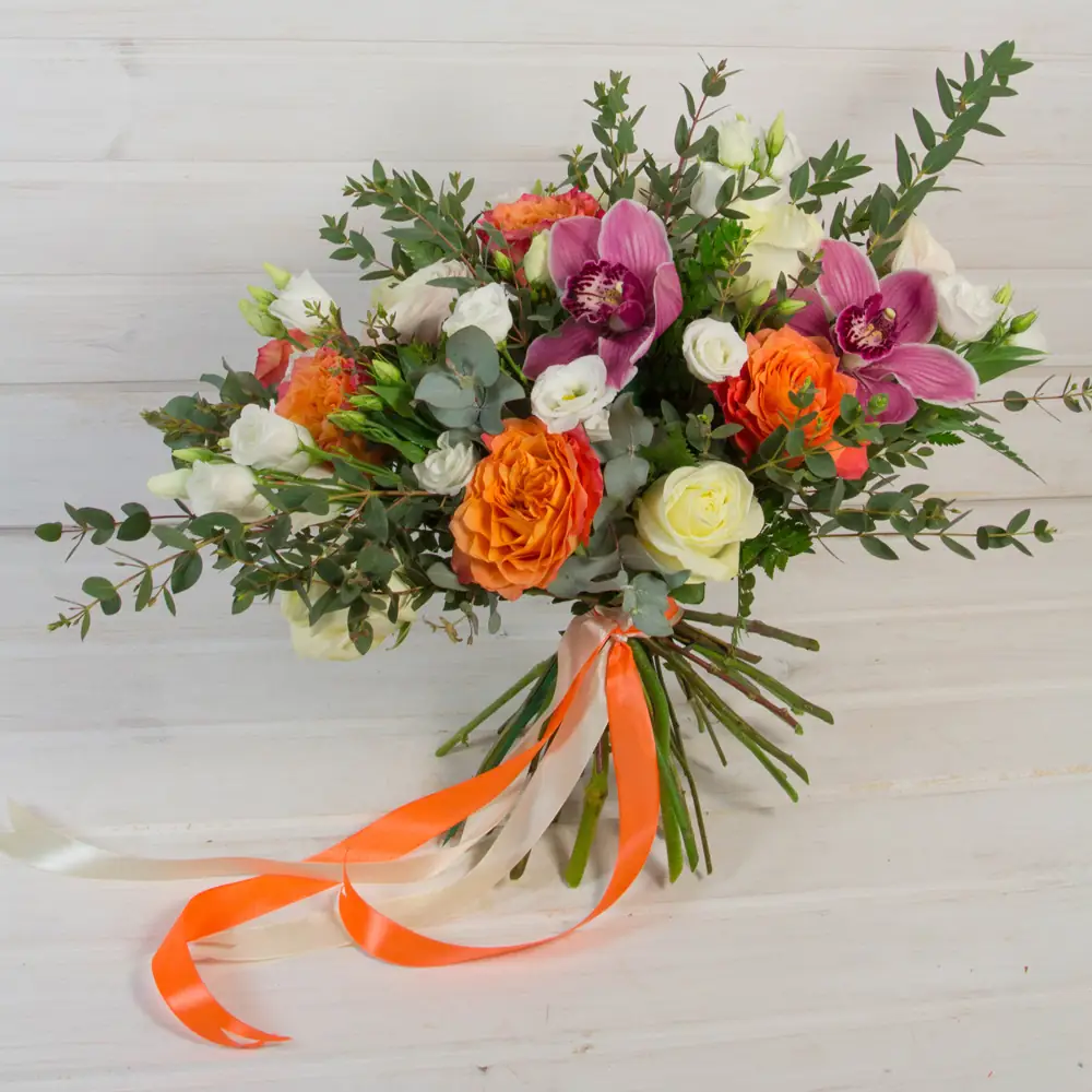 Букет "Барселона" объединяет яркие розы и эффектные орхидеи в необычный, но стильный дуэт.