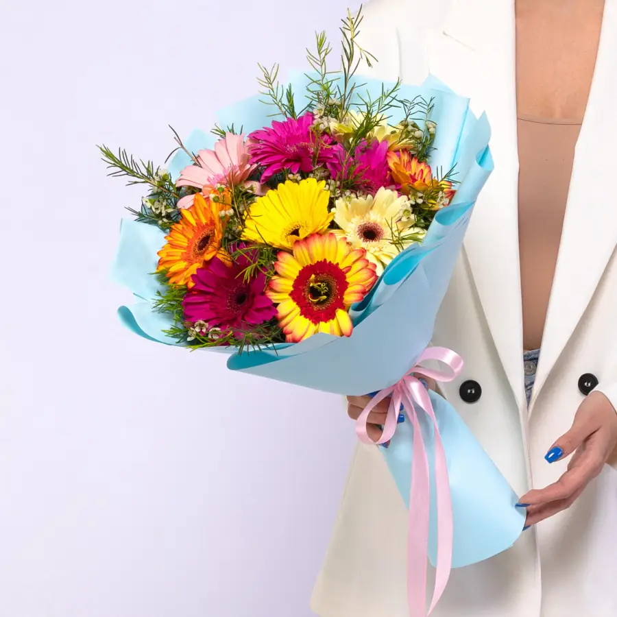 Букет "Герберы и Хамелациум" - пример оформления на фото. Состоит из: Гербера Микс - 11 шт.,