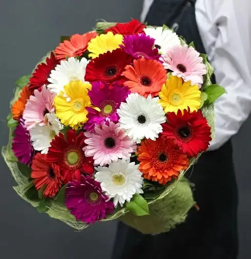 Букет из 25 гербер микс - пример оформления на фото. Состоит из: Гербера - 25 шт.,
