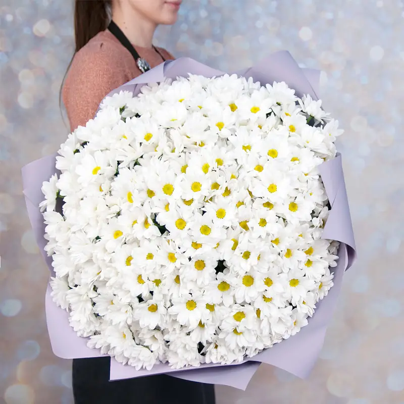 Огромный букет из белых кустовых хризантем непременно произведет впечатление на любую женщину. А с учетом того, что хризантемы очень стойкие цветы, подарок будет радовать долго.