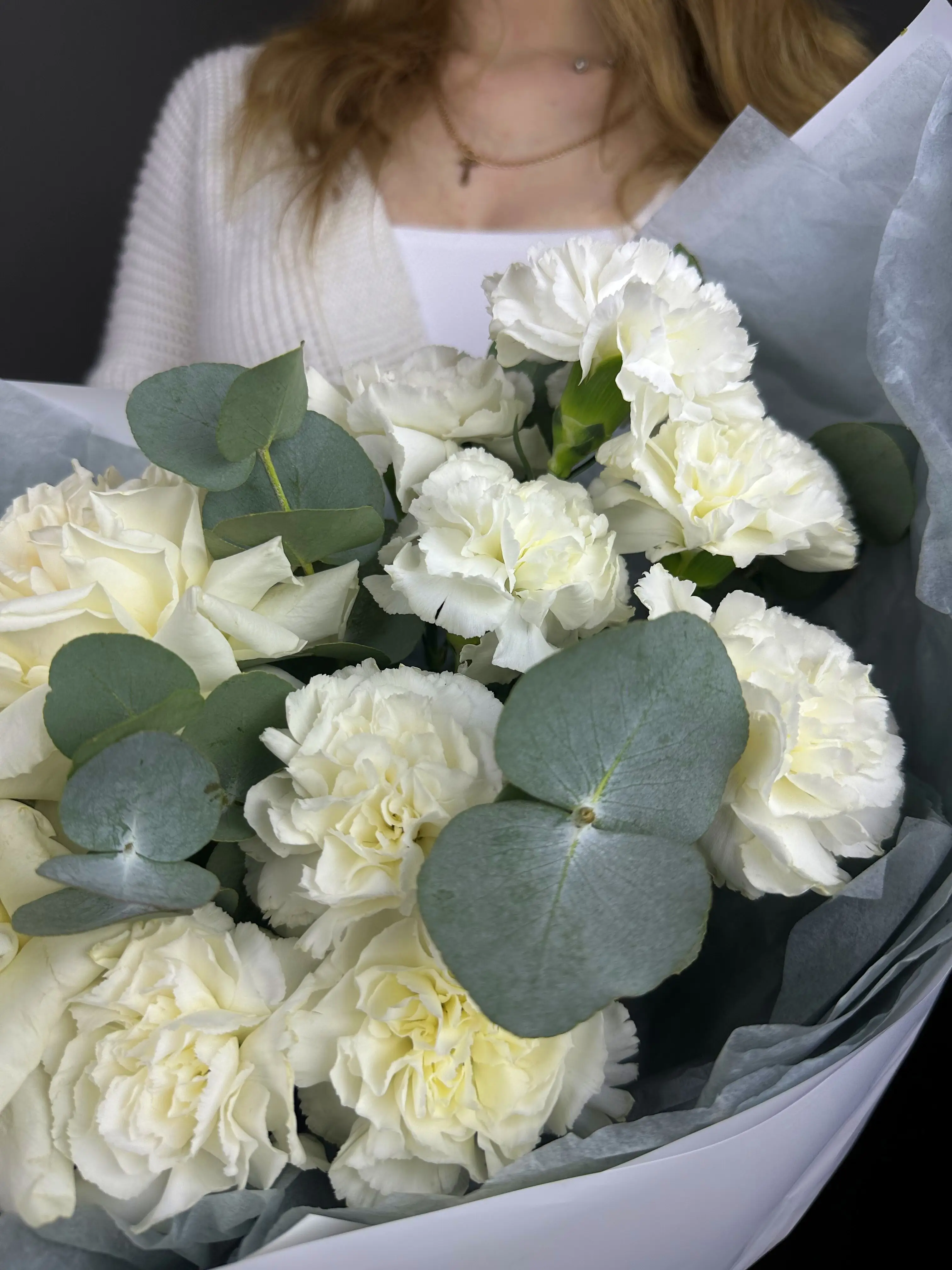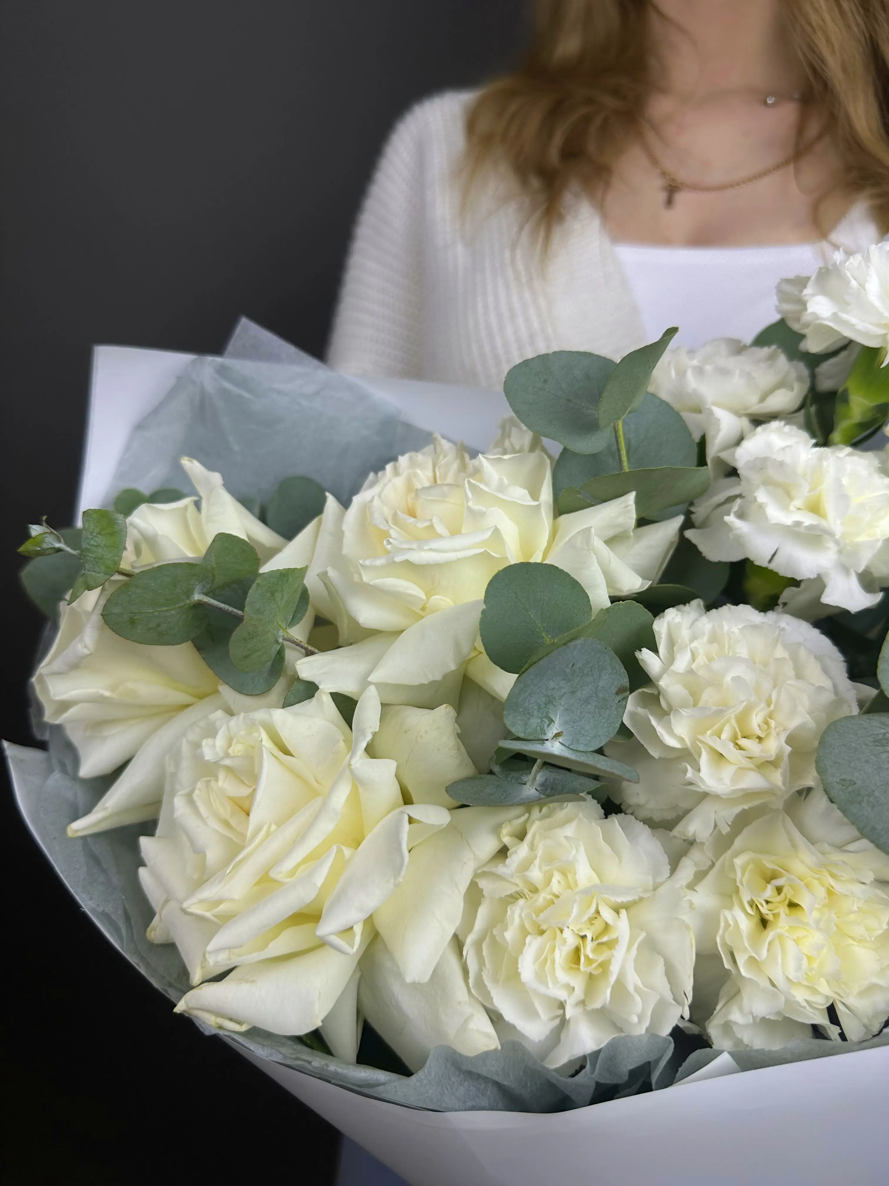 Букет с белыми розами и диантусами - пример оформления на фото. Состоит из: Роза Эквадор - 3 шт,