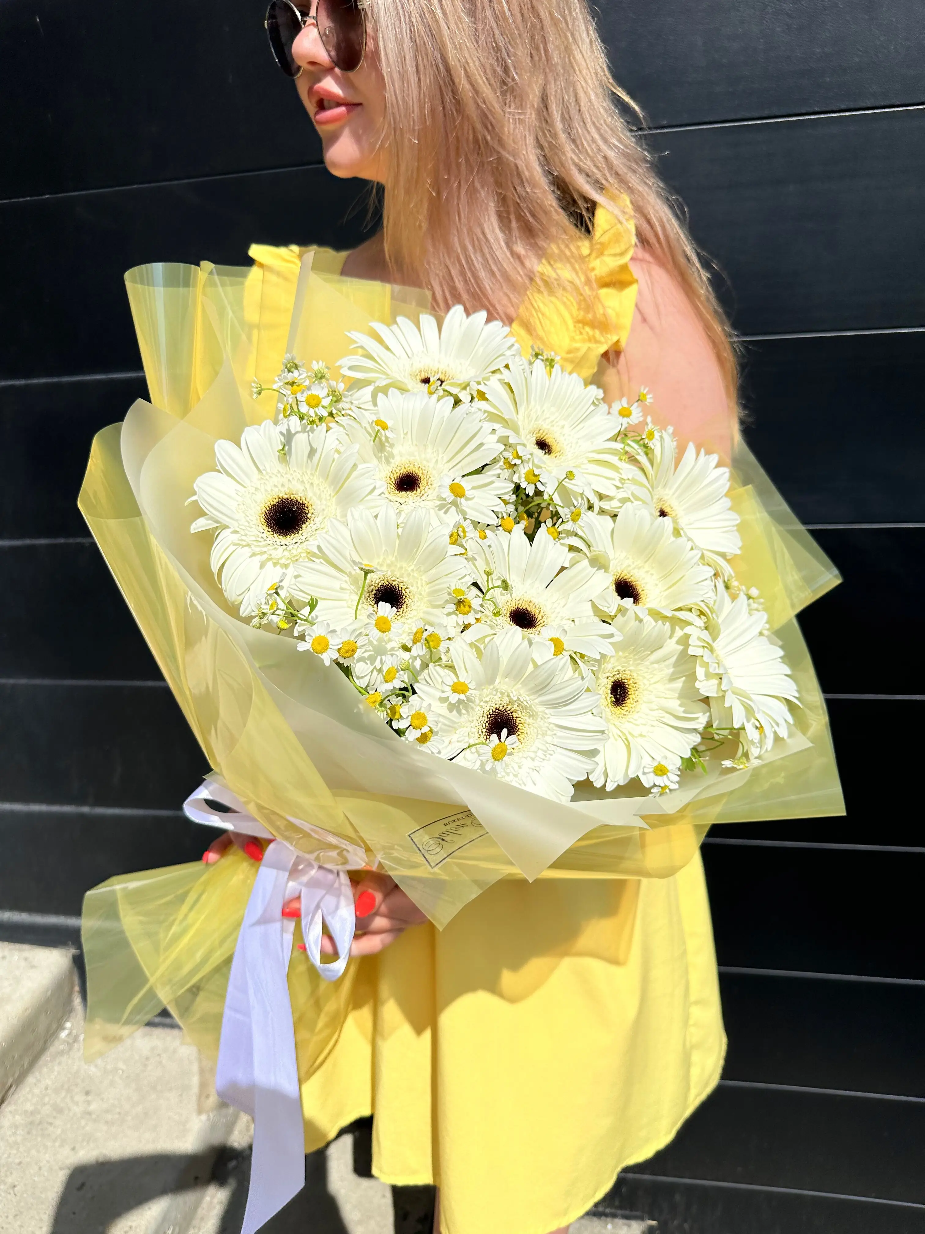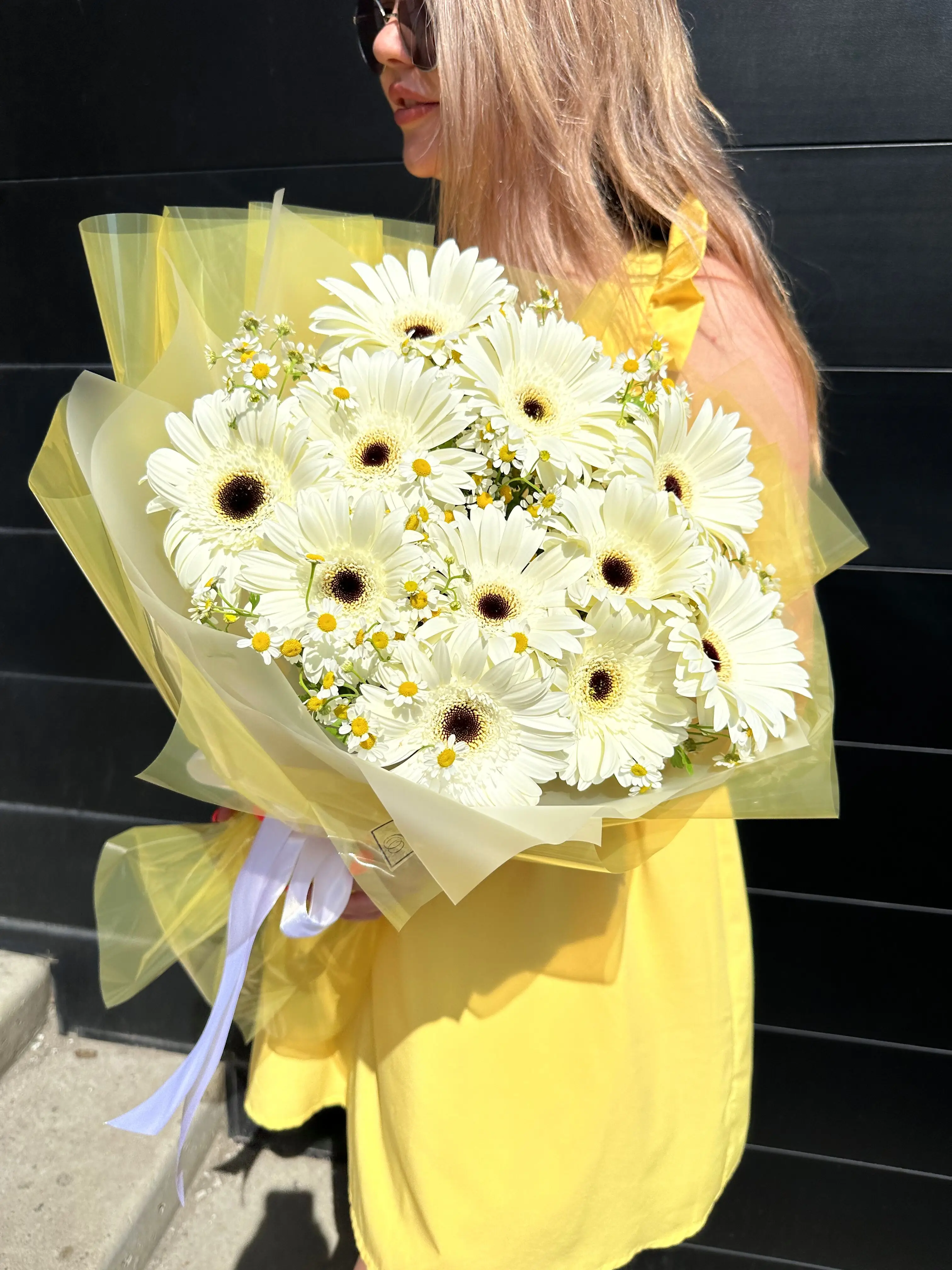 Герберы и матрикарии - пример оформления на фото. Состоит из: Гербера - 11 шт,