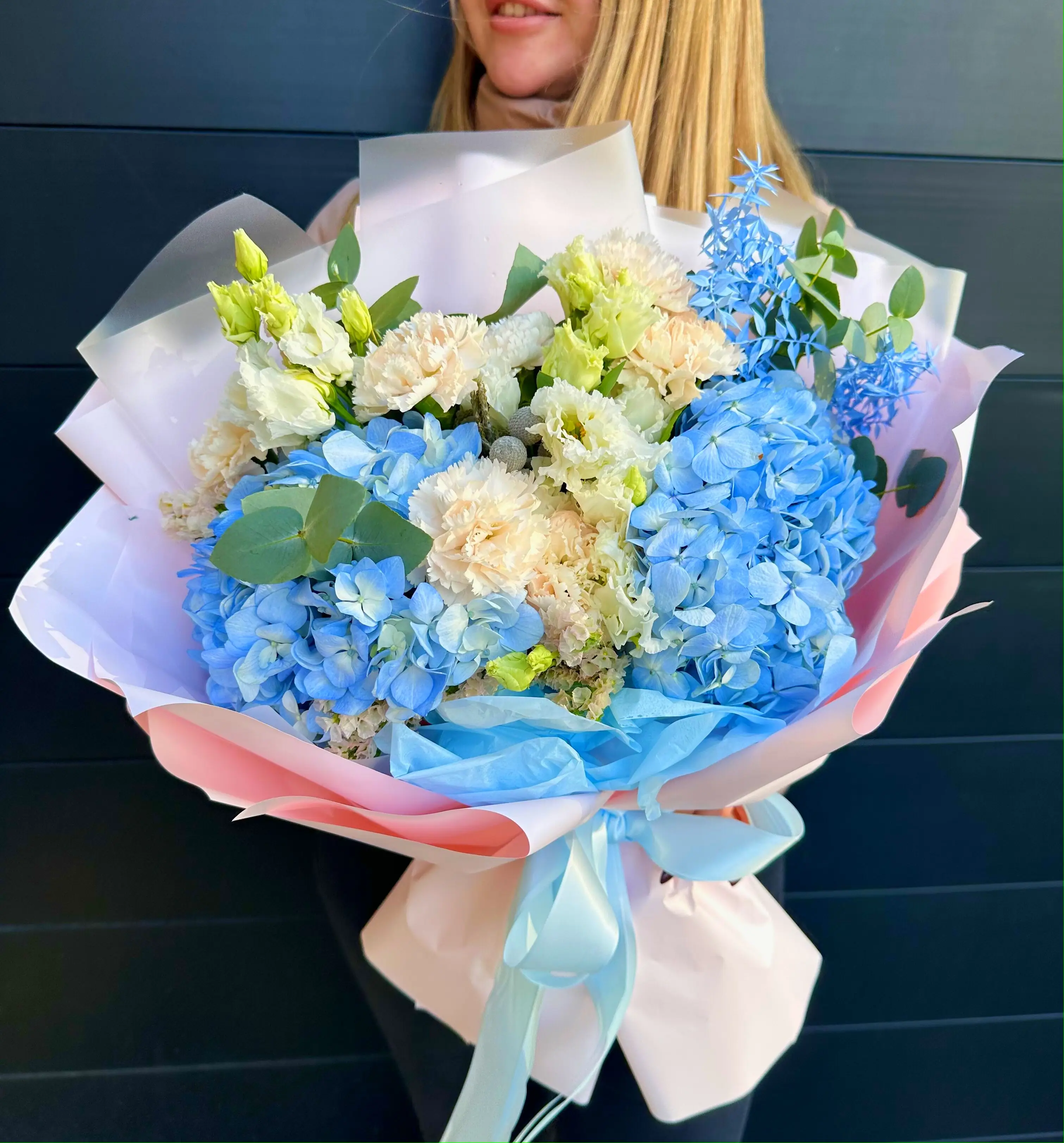 Букет летний из гортензии и эустомы - пример оформления на фото. Состоит из: Гортензия - 2 шт,
