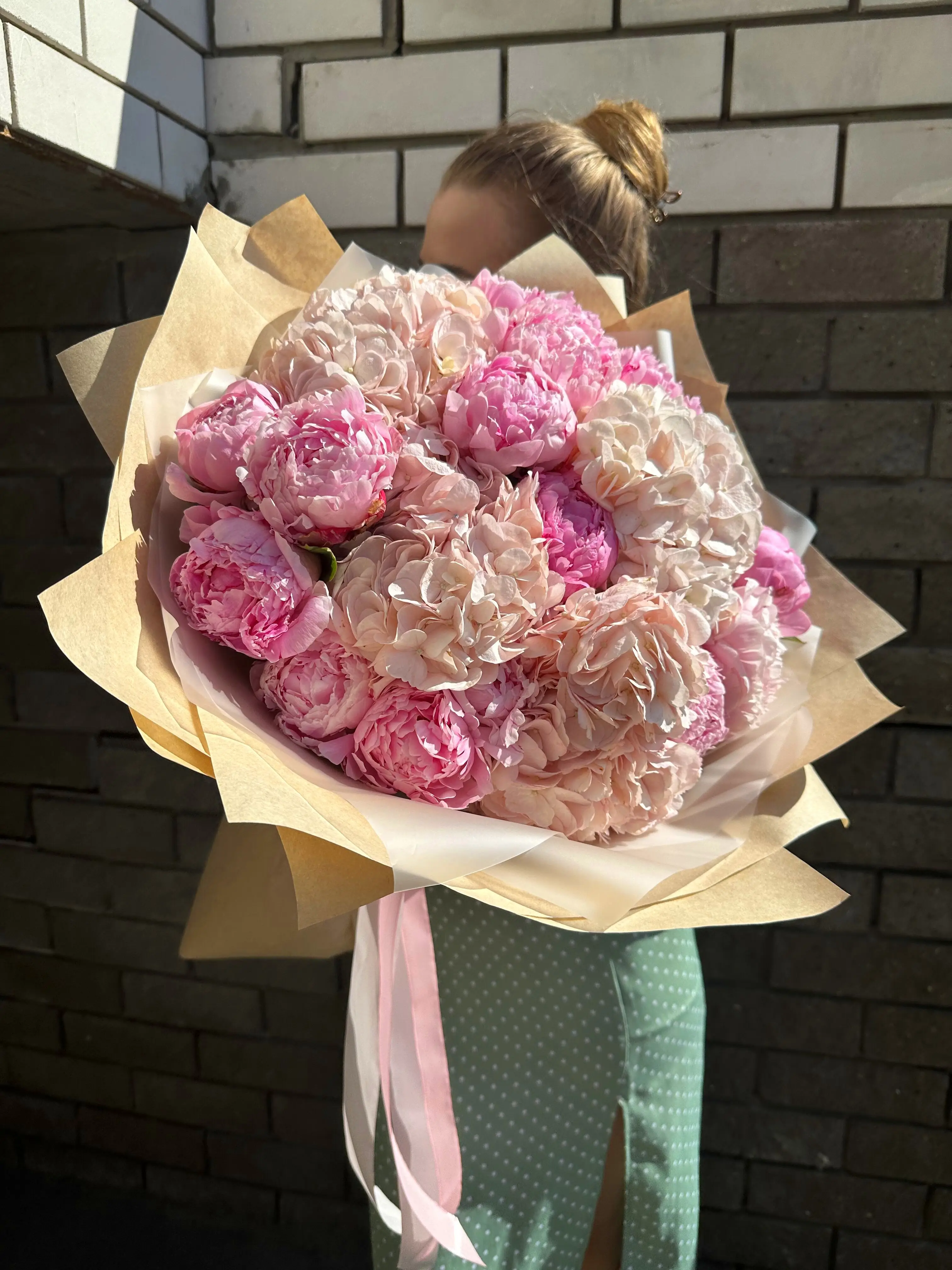 Этот роскошный букет сочетает в себе нежность и элегантность. Гортензии с их пышными соцветиями создают объем и воздушность композиции, а пионы добавляют яркости и утонченности. Букет идеально подойдет как для особого случая, так и для повседневного подарка.