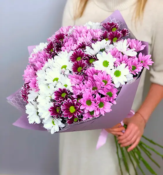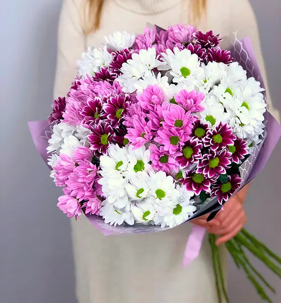 Сборный букет авторский из хризантем микс - пример оформления на фото. Состоит из: Хризантема кустовая - 15 шт.,