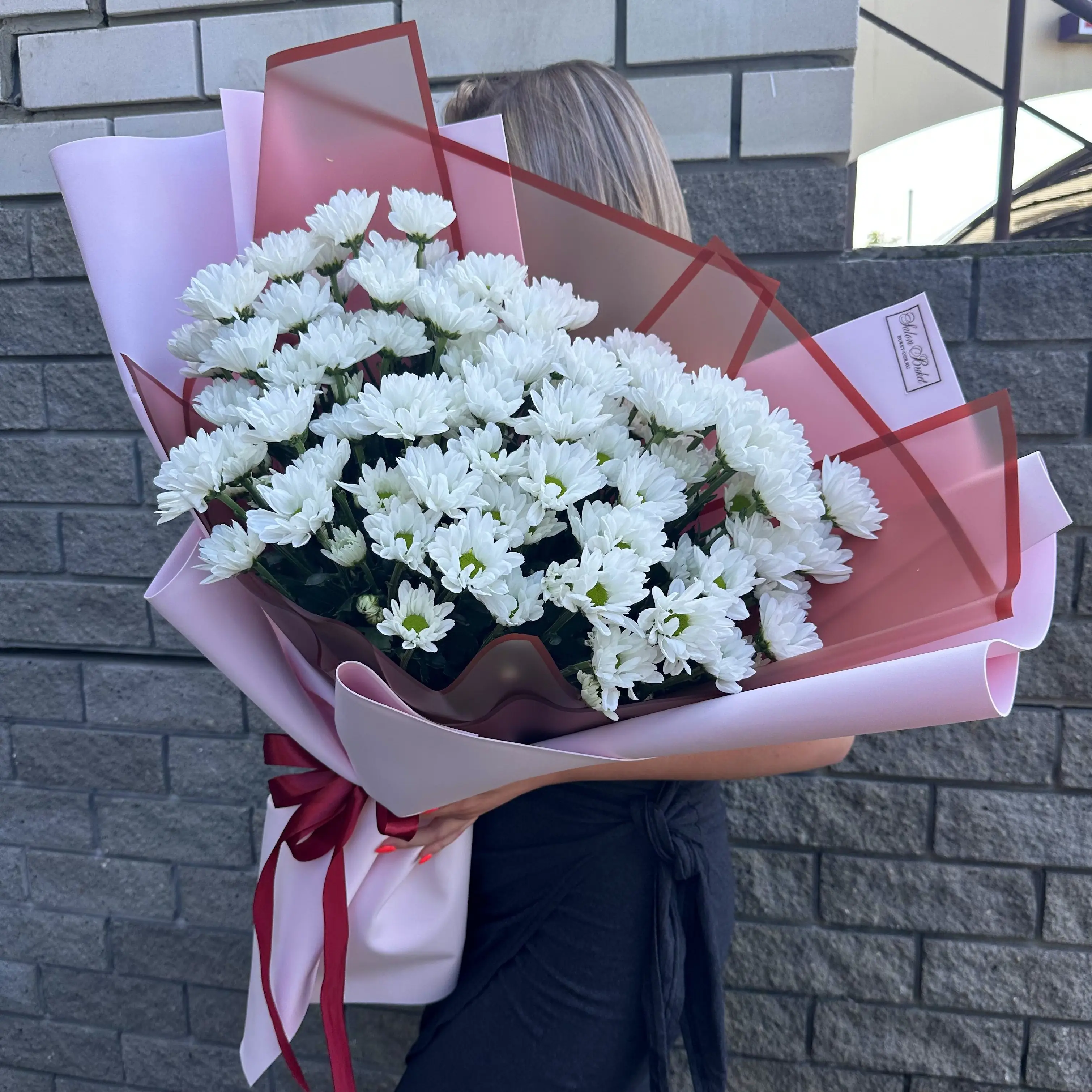 Хризантема белая, Дизайнерская упаковка. Собираем только из свежих цветов, после сборки пришлем Вам фото. Доставим по г. Дзержинску и Нижегородской области, стоимость - 4500 руб..