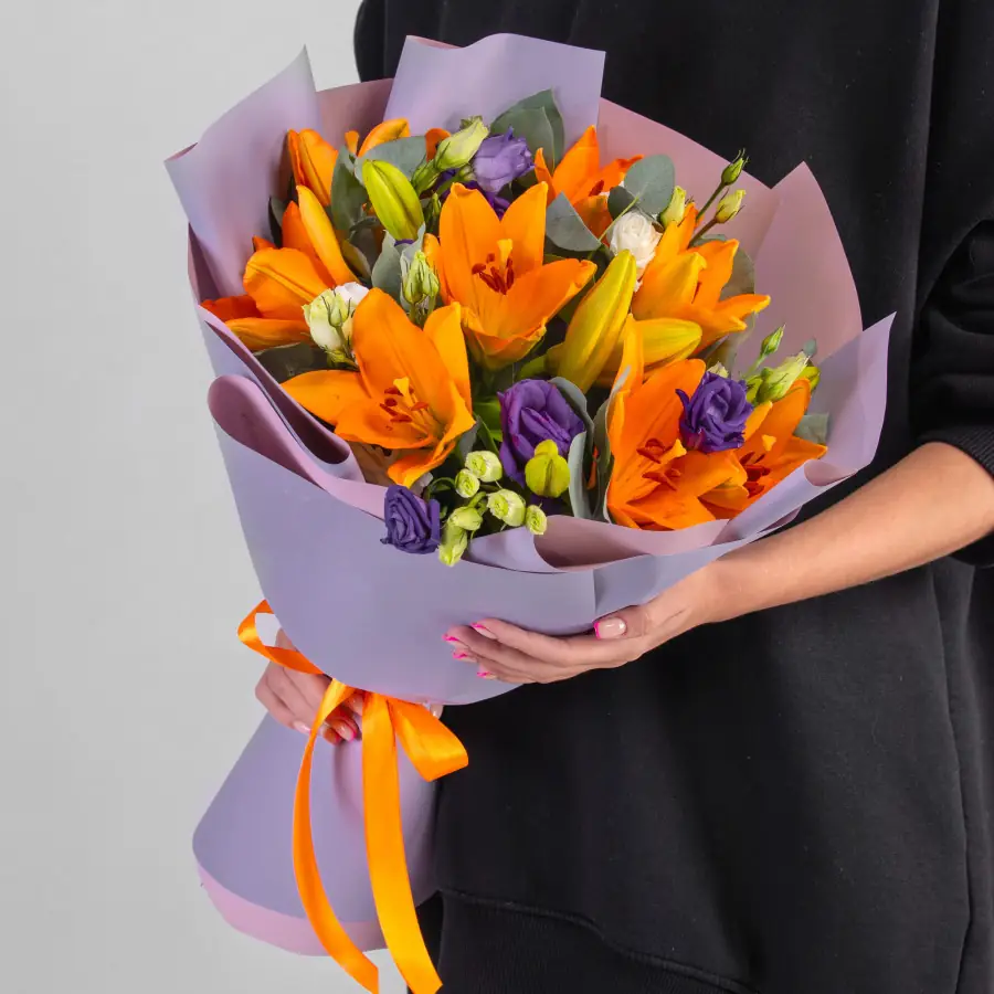 Букет из лилий и эустом - пример оформления на фото. Состоит из: Лилия - 4 шт,