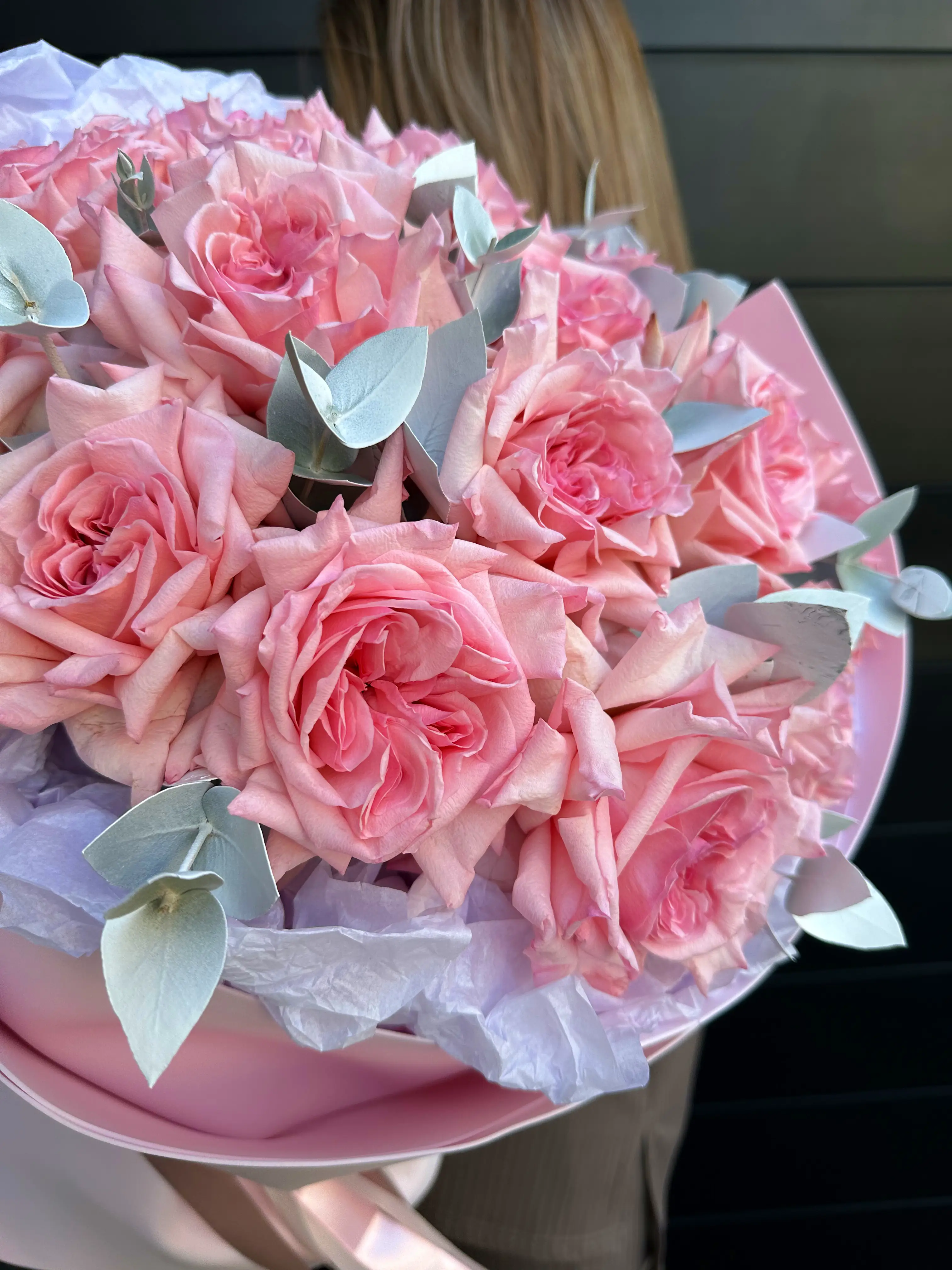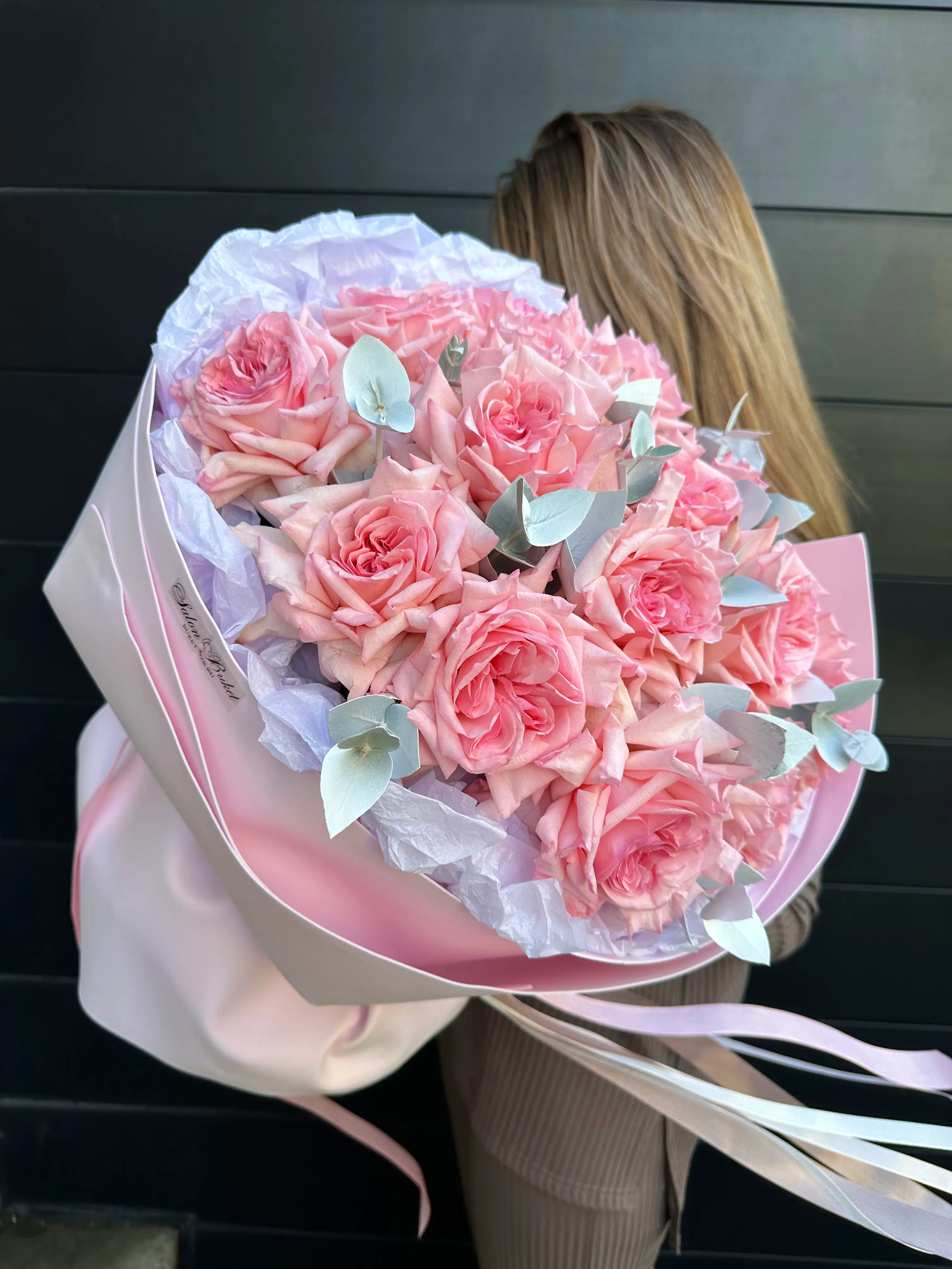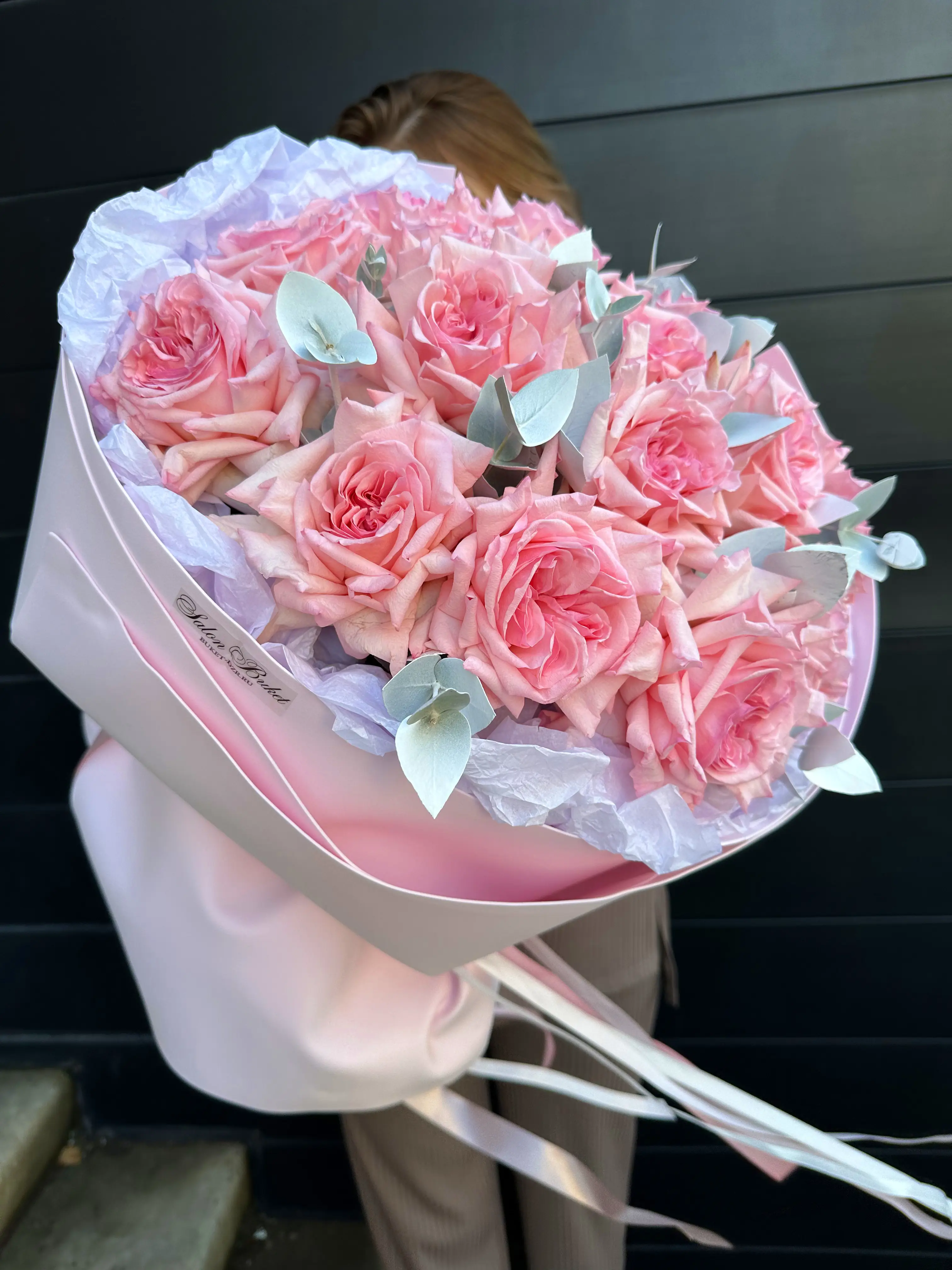 Букет из 15 нежных пионовидных роз с Эвкалиптом - пример оформления на фото. Состоит из: Роза Пионовидная - 15 шт,