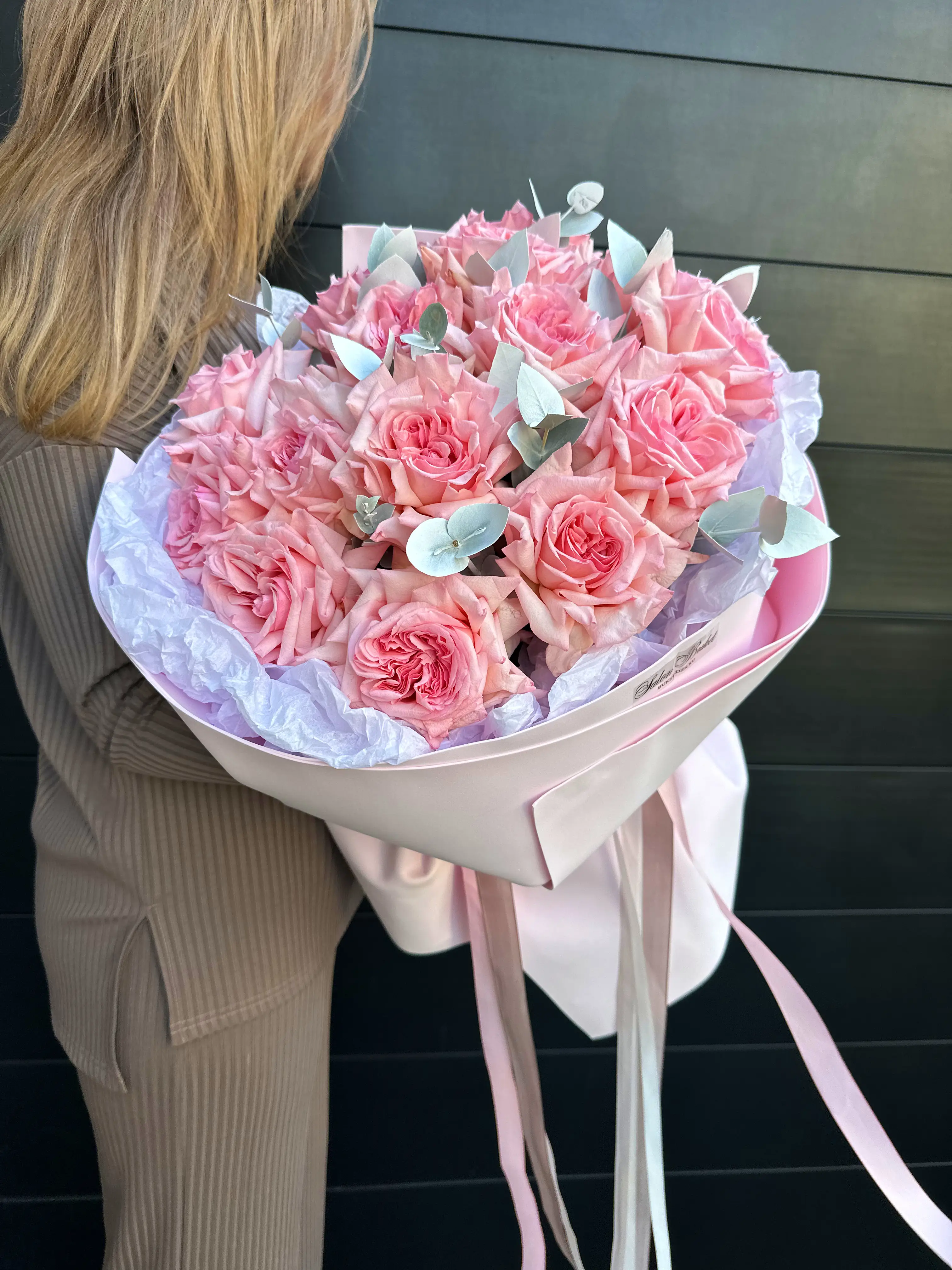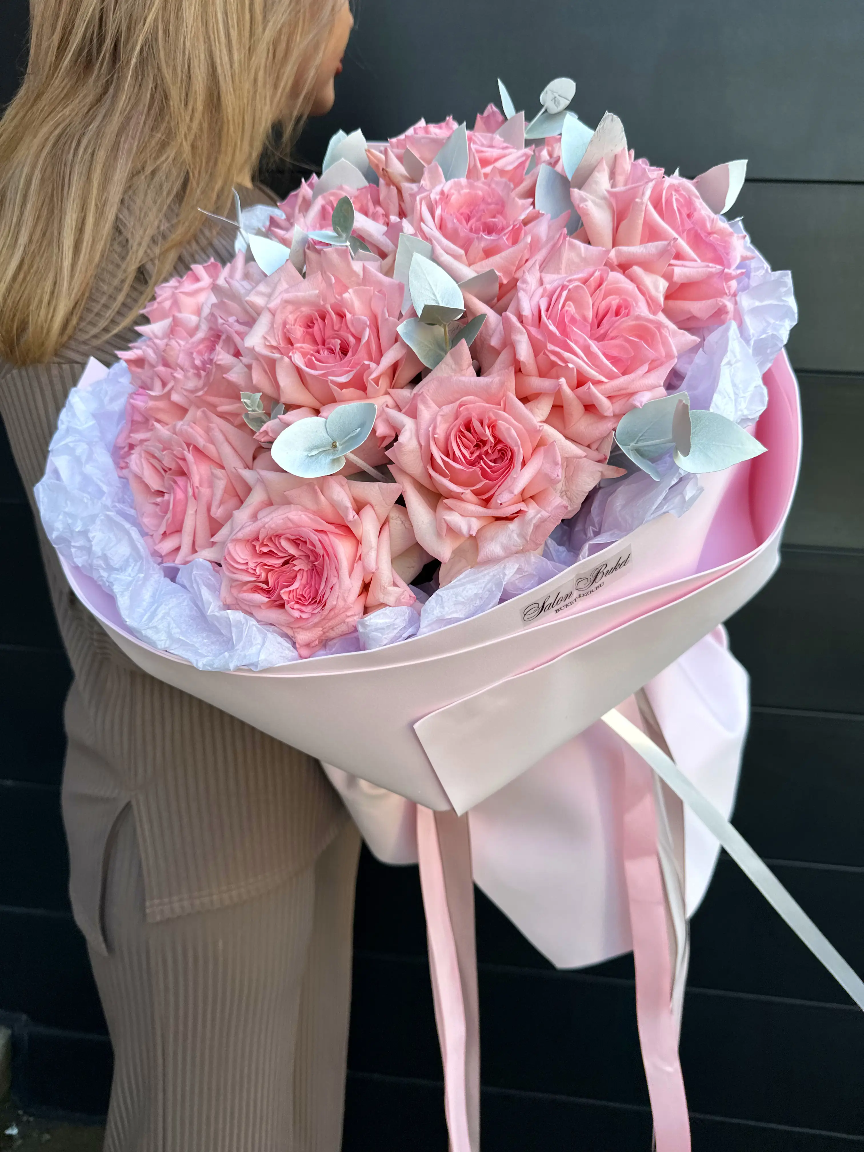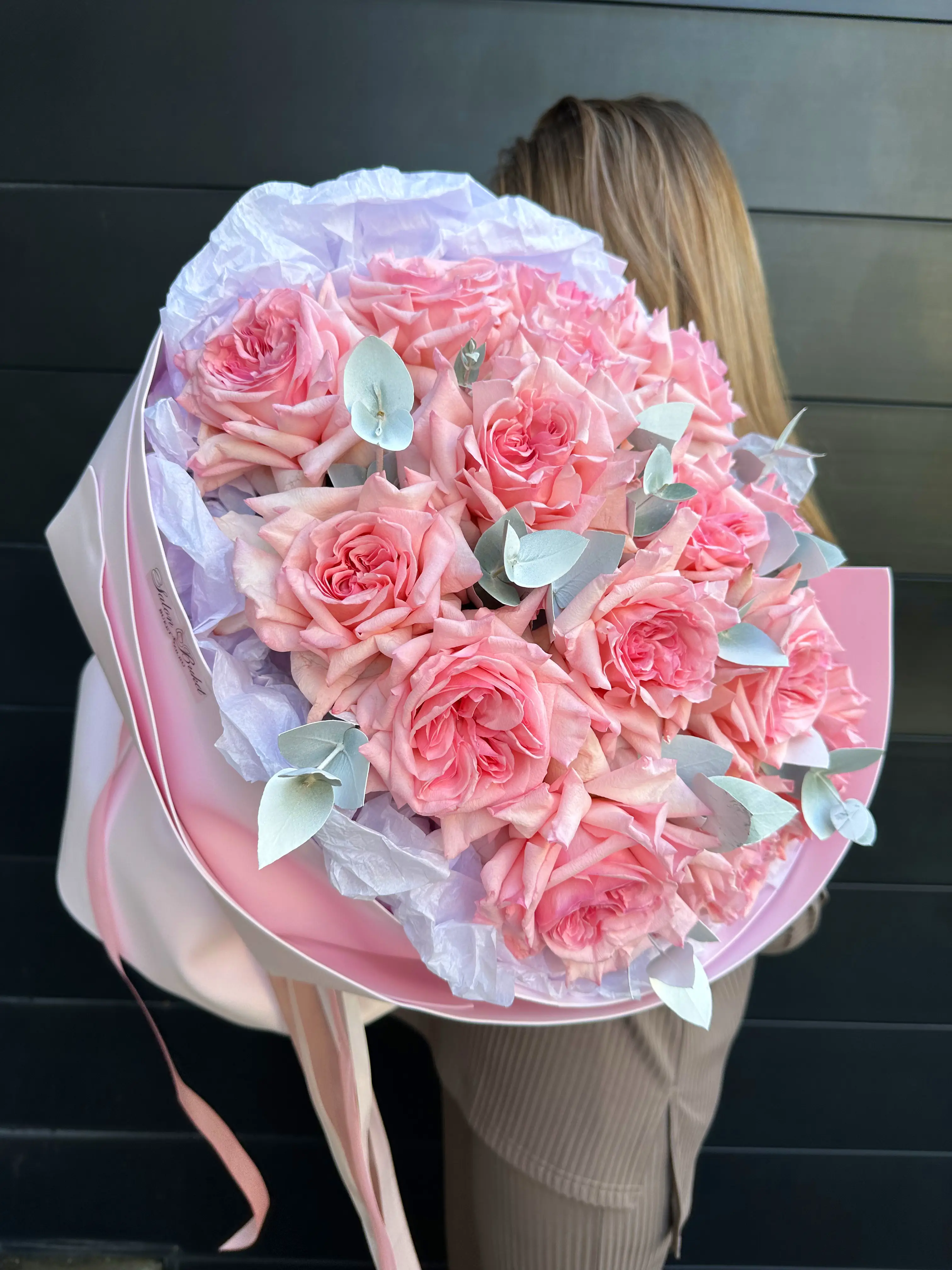 Букет из 15 нежных пионовидных роз с Эвкалиптом - пример оформления на фото. Состоит из: Роза Пионовидная - 15 шт,