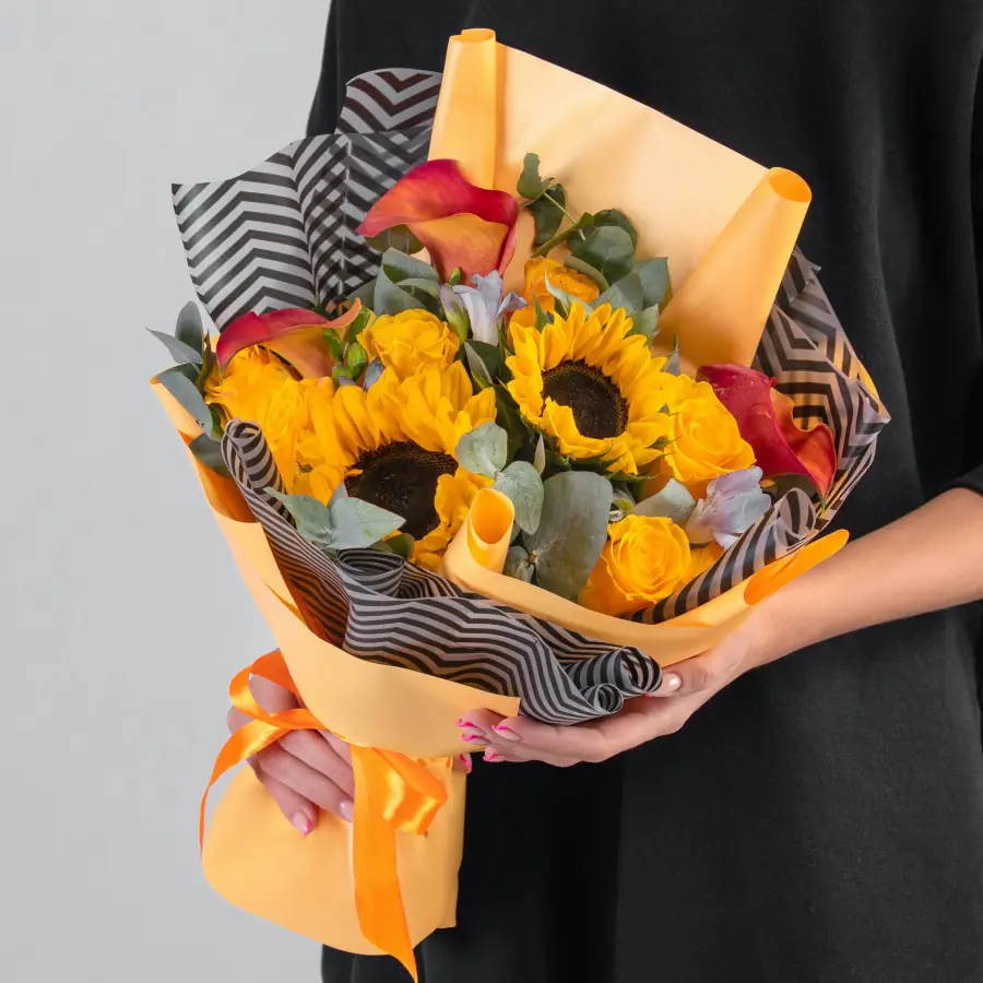 Букет из подсолнухов и калл - пример оформления на фото. Состоит из: Подсолнух - 2 шт,